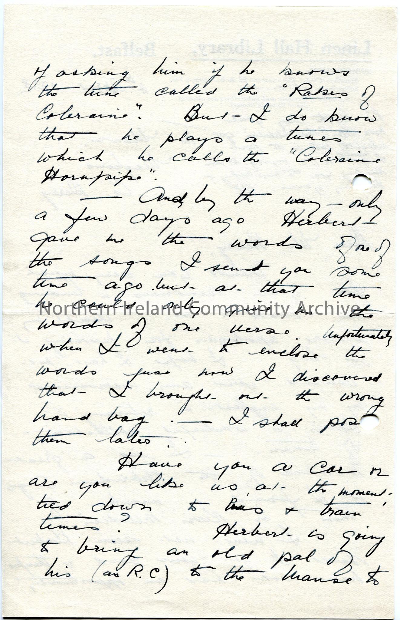 One of 2 pages of handwritten letter re thanks for book of songs, information about songs in return and arranging visit of friend with collection of songs. Talks about Herbert and his input.