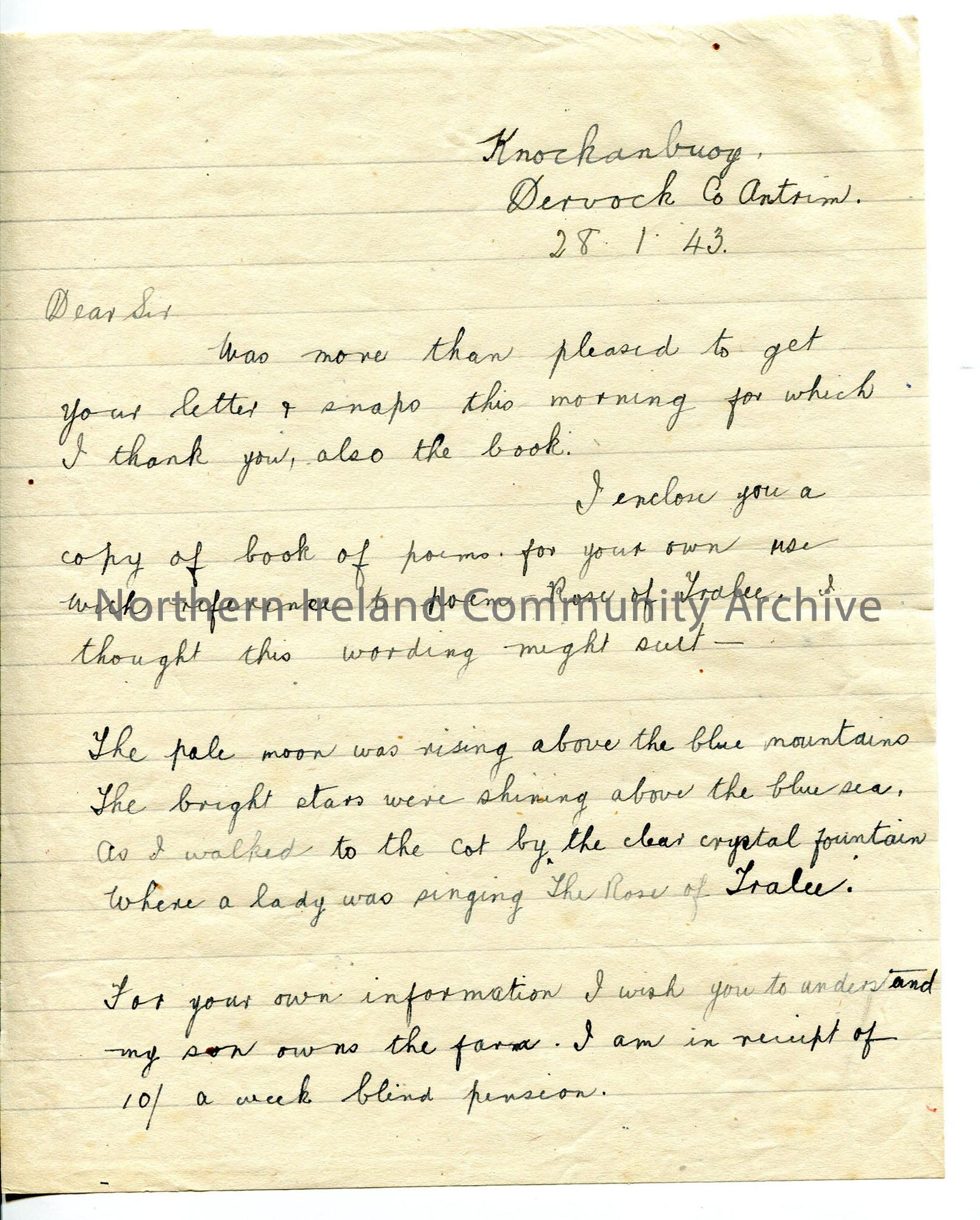 One of 2 pages of handwritten letter, stating book enclosed and draws reference to ‘Rose of Tralee’ – gives alternative wording in letter.