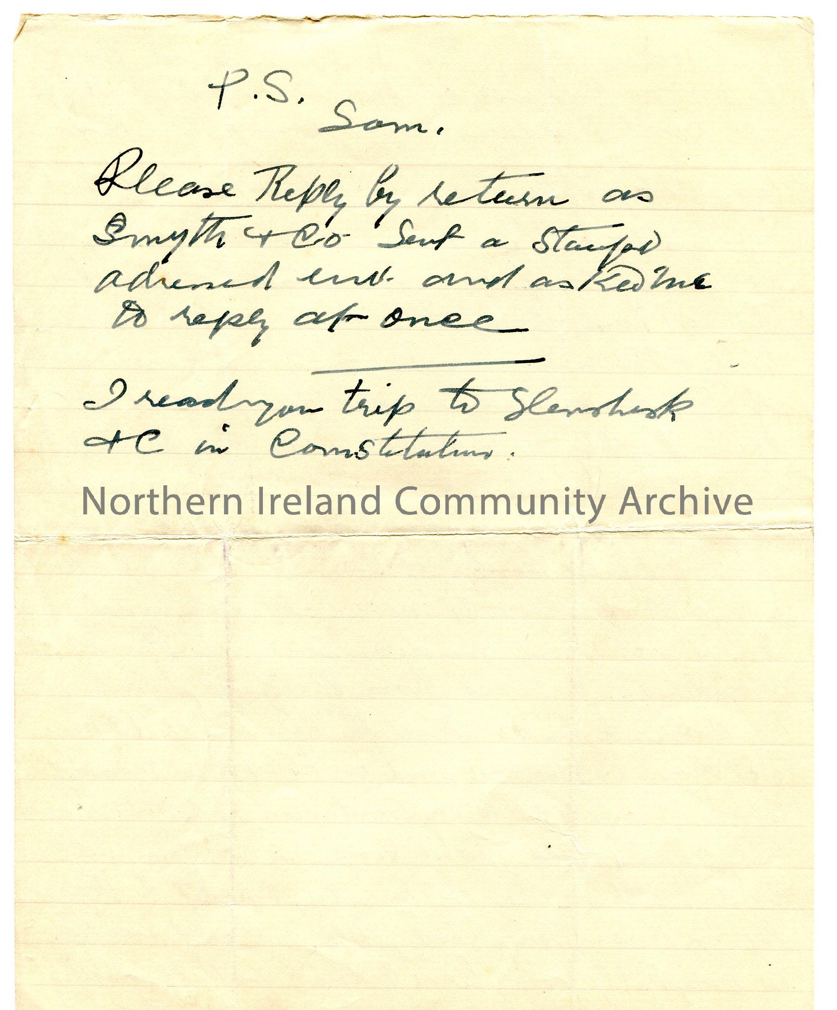 One of 2 pages of handwritten letter to Sam Henry from John MacAulay, the Bog Oak Carver from Ballycastle, re the McCormick family – a travelling fidd… – img402