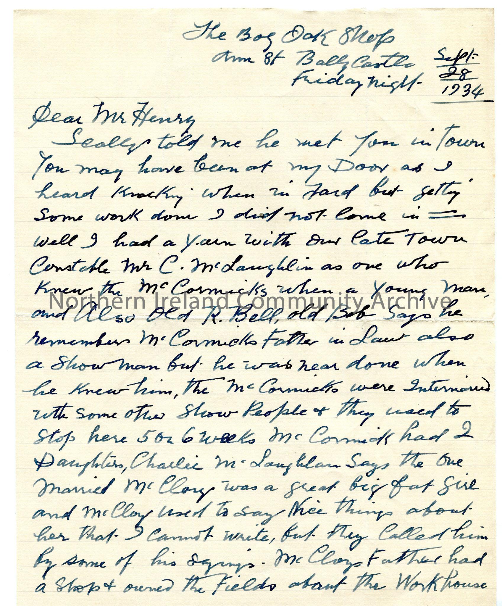 One of 2 pages of handwritten letter to Sam Henry from John MacAulay, the Bog Oak Carver from Ballycastle, re the McCormick family – a travelling fidd…
