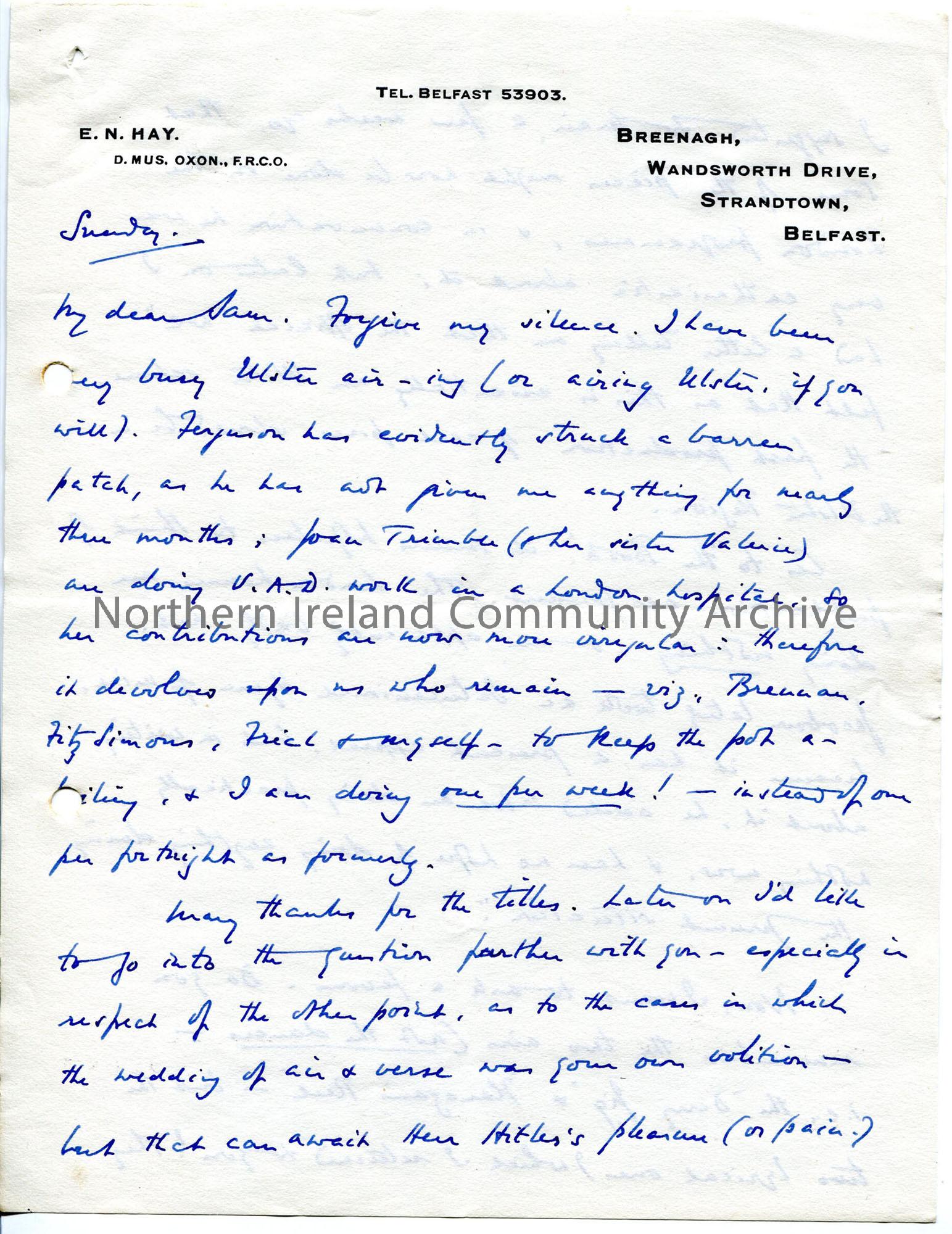 One of 2 pages of handwritten letter, using 3 sides. Ulster Airs work held up by usual contributors doing WWII war work… Thanks Sam for songs sent. …