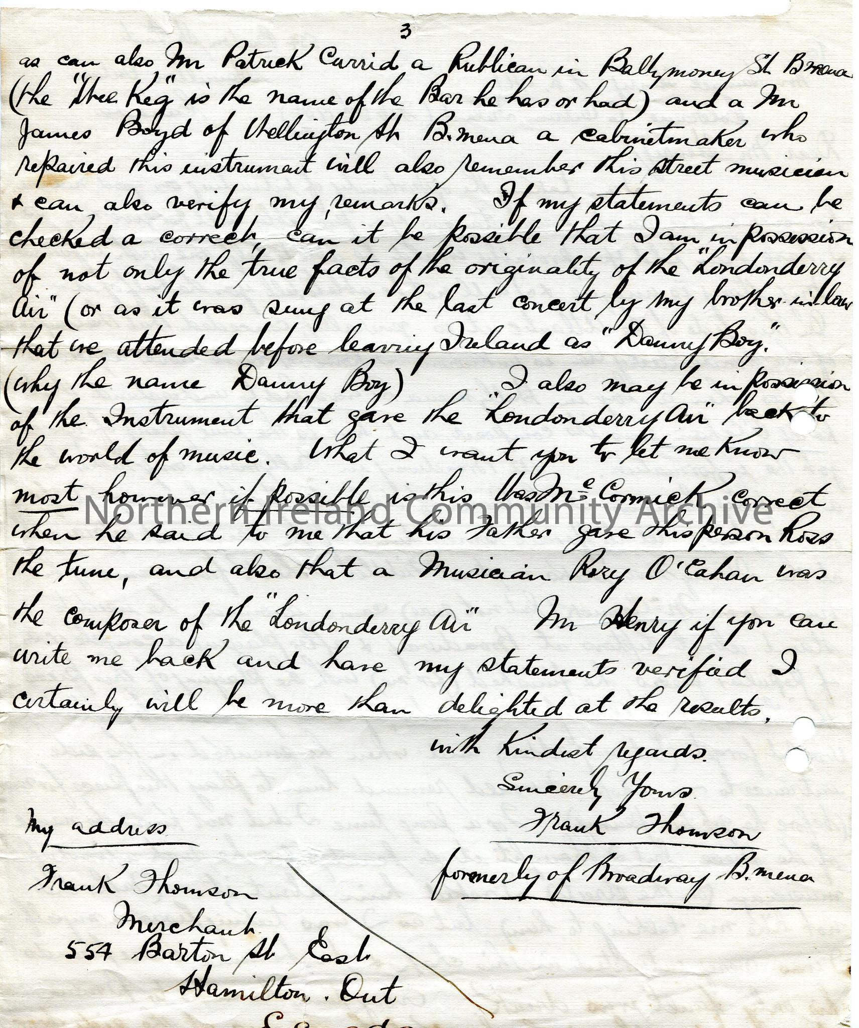 One of 2 pages of handwritten letter written on 3 sides (page 3 on back of page 1) from a Ballymena man living in Canada re ‘The Londonderry Air’, McC… – img355