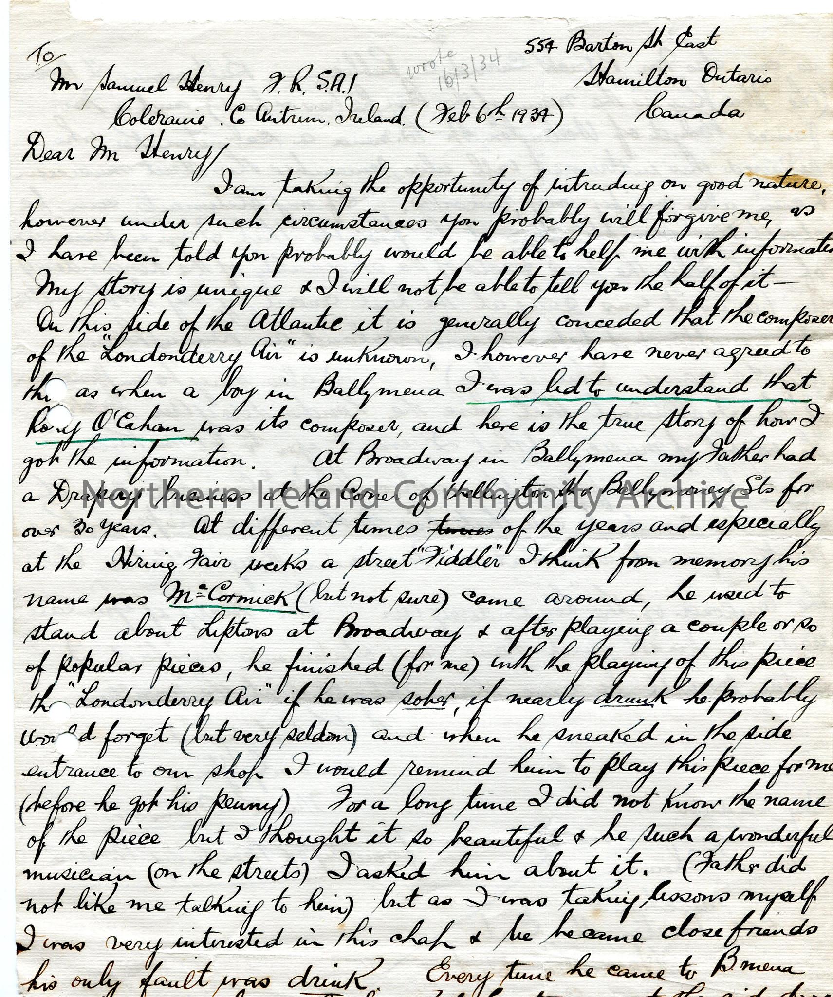 One of 2 pages of handwritten letter written on 3 sides (page 3 on back of page 1) from a Ballymena man living in Canada re 'The Londonderry Air', McCormick [a travelling fiddler called McCormick is supposed to be the fiddler from whose playing the Londonderry Air was noted] and Rory O'Cahan.