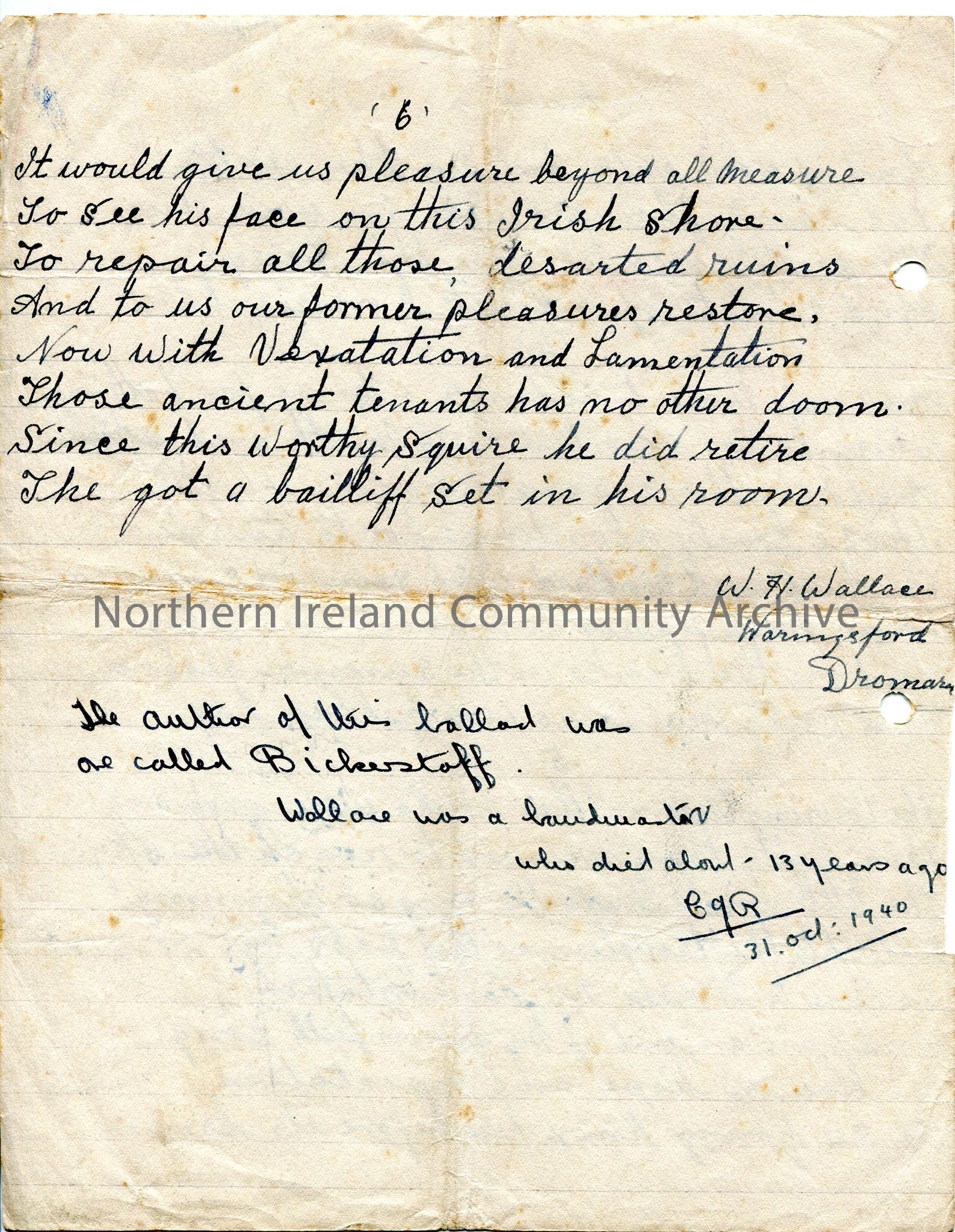 One of 2 pages of handwritten words on 3 sides to 'Waringsford Lamentation', with notes re donor