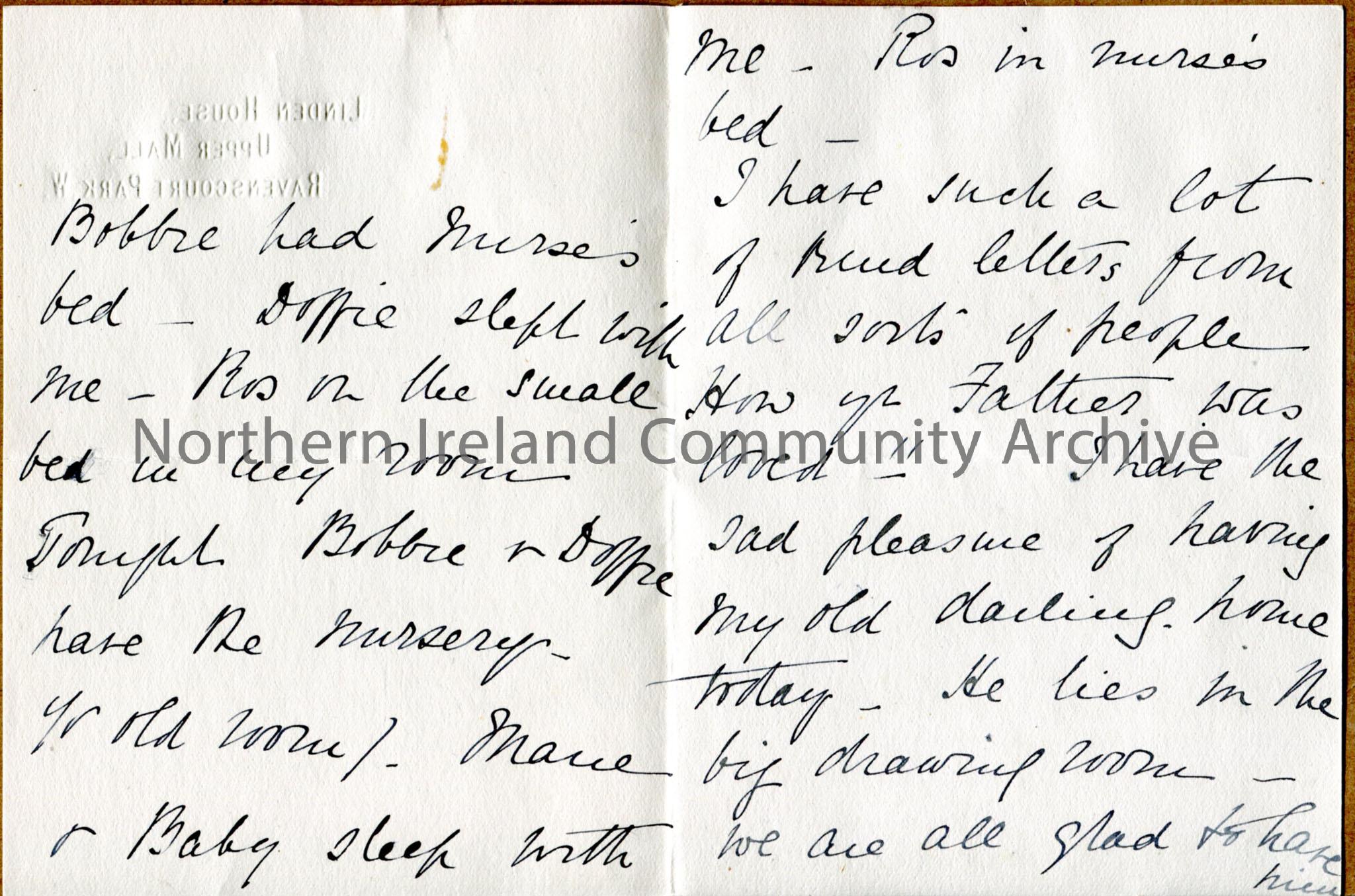 One of 2 pages of letter from Mrs Arter to son Bertie who is in Bournemouth. Her husband is dead – Dorothy, Bobby and baby have arrived, she describes… – img104b