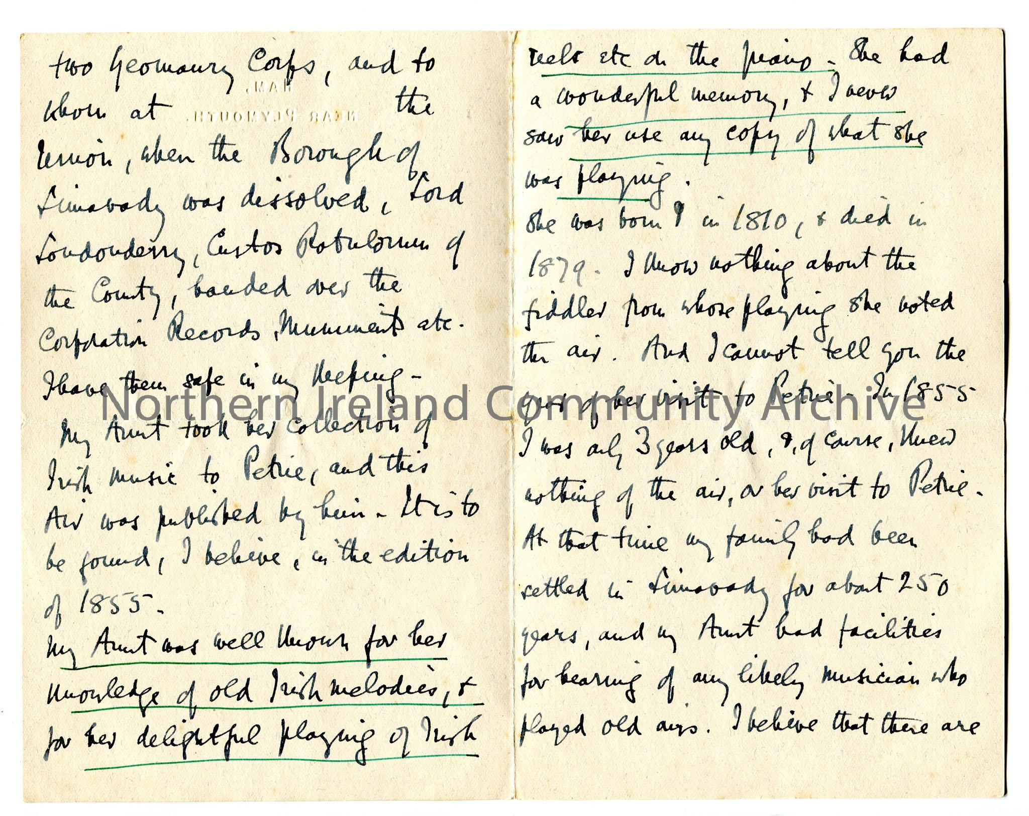 One of 2 pages of letter from Rev Trelawney-Ross re history of Ross family, links to Londonderry Air, ownership of Limavady Corportion records.