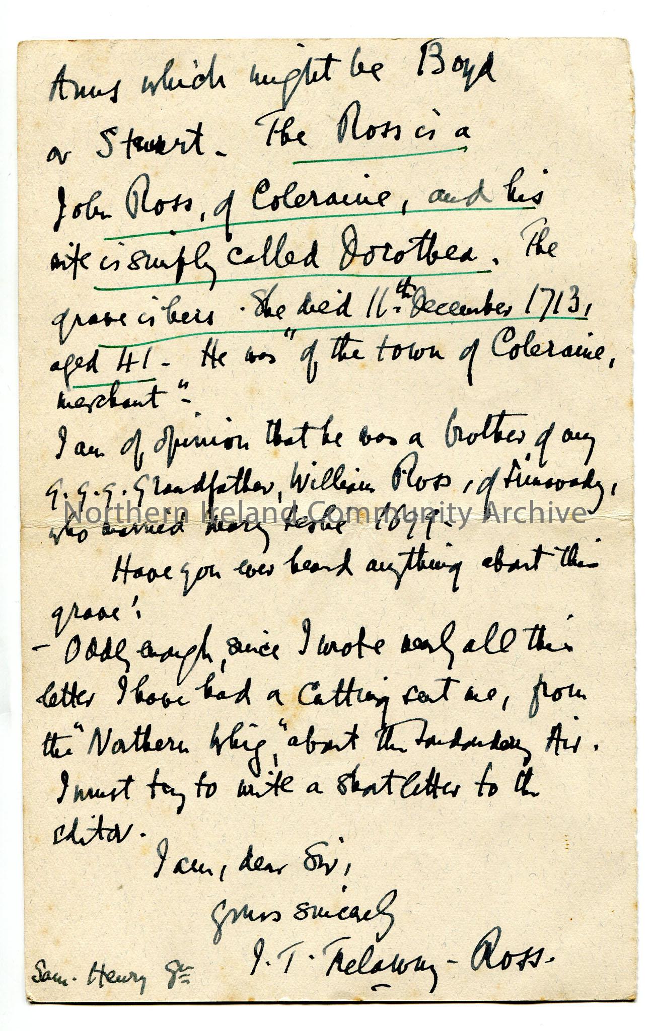 One of 2 pages of letter from Rev Trelawney-Ross re history of Ross family, links to Londonderry Air, ownership of Limavady Corportion records. – img476