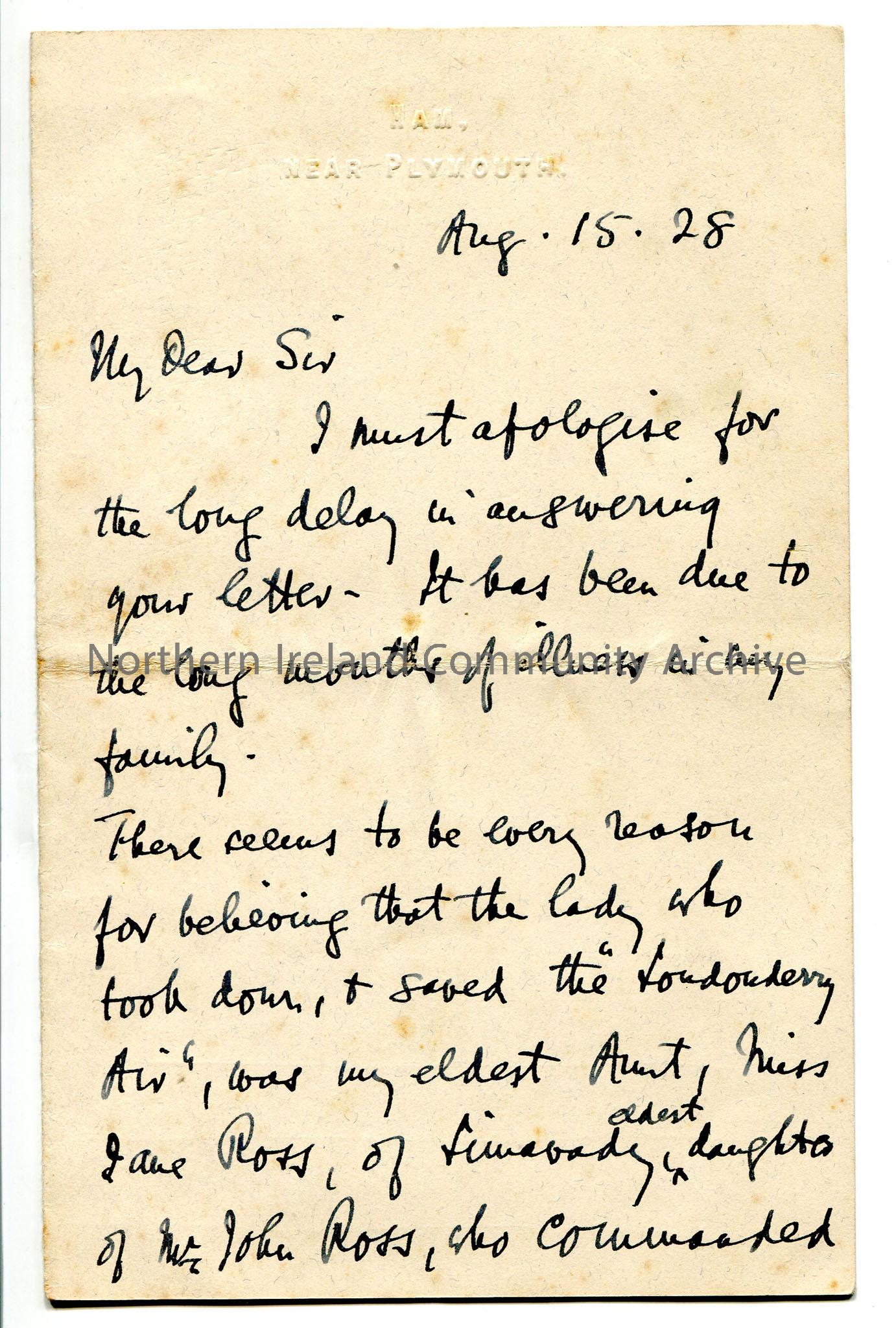 One of 2 pages of letter from Rev Trelawney-Ross re history of Ross family, links to Londonderry Air, ownership of Limavady Corportion records.