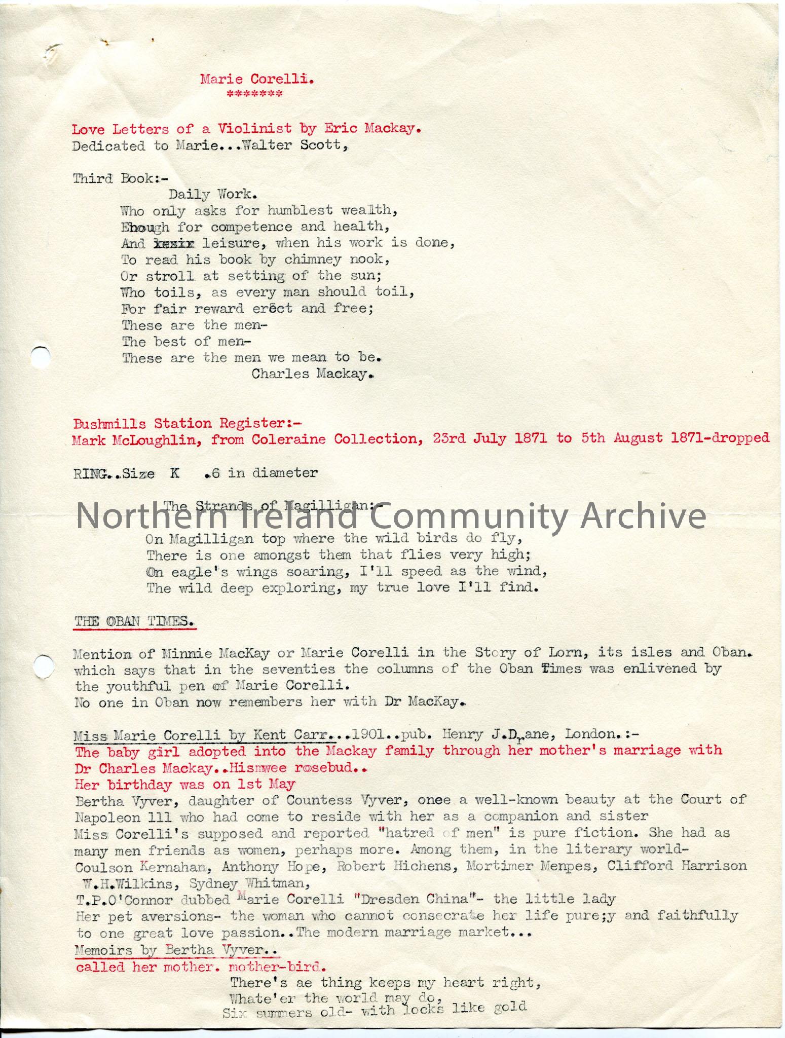 One of 2 pages of typed brief notes under heading ‘Marie Corelli’. Includes words verses – one uses local dialect