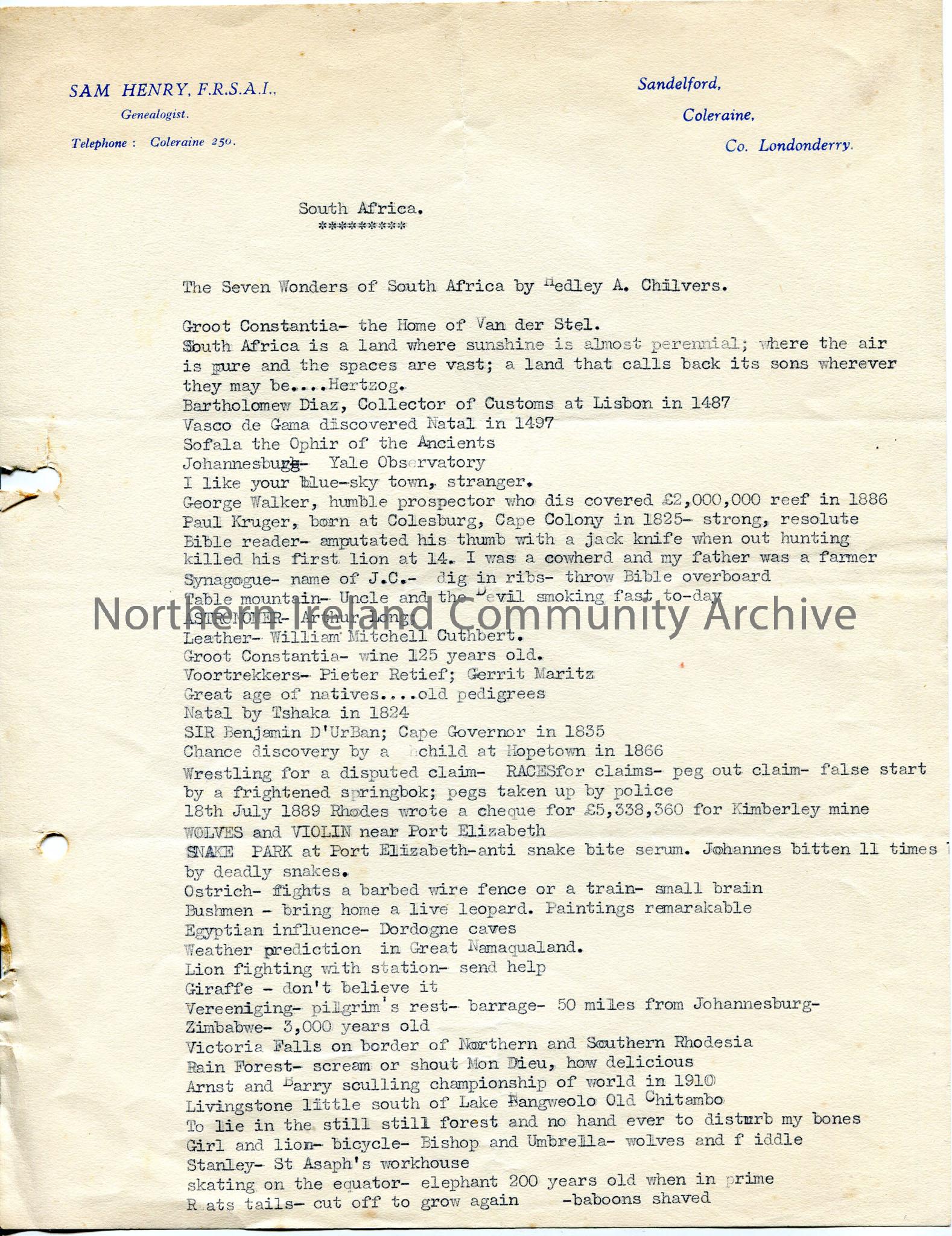 One of 2 pages of typed brief notes under heading ‘South Africa – The Seven Wonders of South Africa by Hedley A Chivers’ – geographical, historical an…
