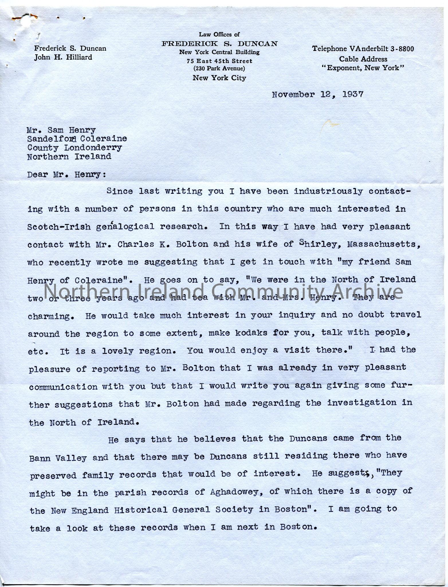 One of 2 pages of typed letter on headed notepaper. Mr Duncan has met with the Boltons of Shirley, Massachusetts, who know Sam. They have suggested some sources for him. He has been contacting a lot of people interested in 'Scotch-Irish genealogical research'.