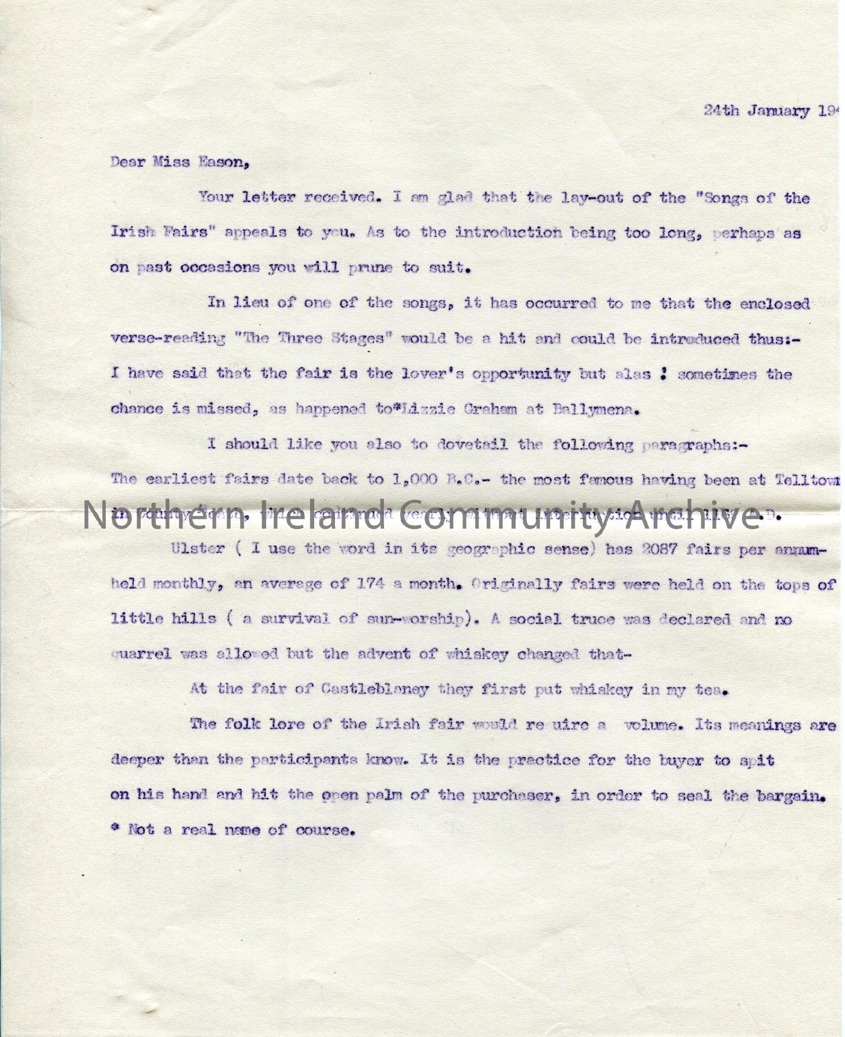 One of 2 pages of typed letter to Miss Eason (Ursula Eason, Sam's contact at BBC in Belfast) with suggested amendments to 'Songs of the Irish Fairs' broadcast script and information on facts and traditions associated with fairs