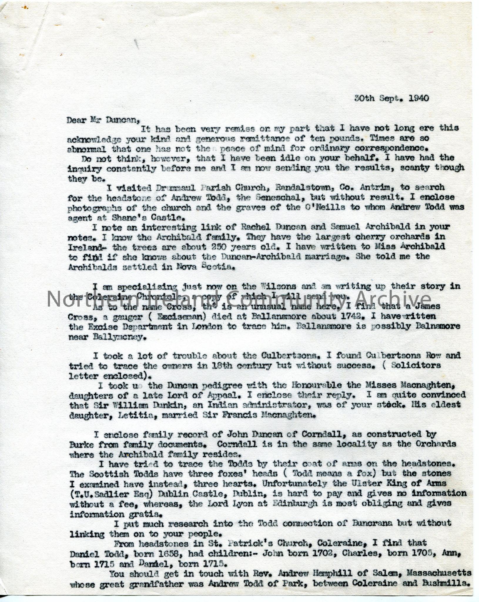 One of 2 pages of typed letter updating on research – Todds, Duncans, links to Archibalds, headstone inscriptions, coat of arms different for Todds in…