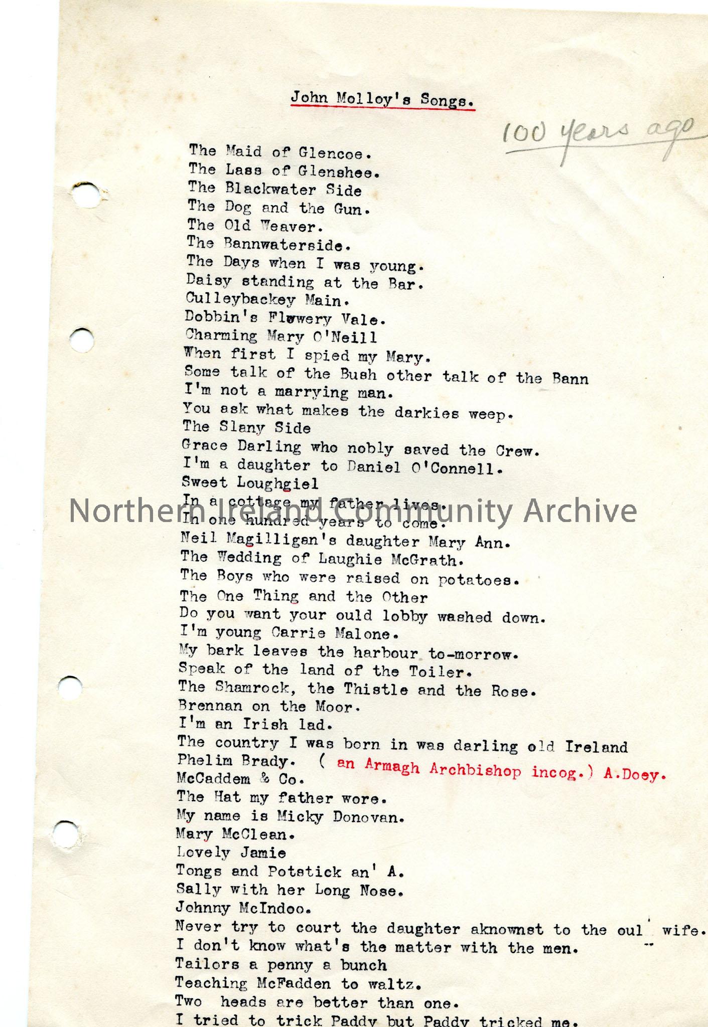 One of 2 pages of typed list of ‘John Molloy’s Songs’, with handwritten addition ‘100 years ago’.