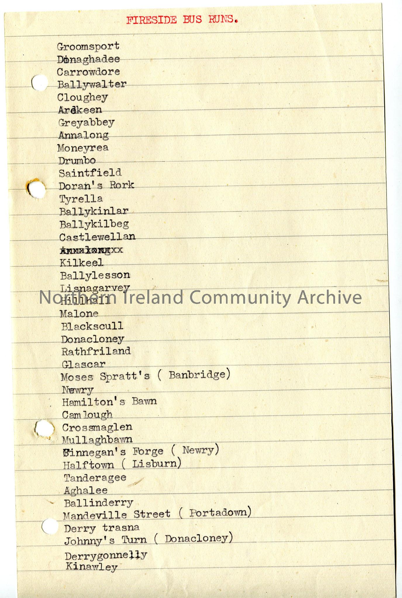 One of 2 pages of typed list of placenames under heading ‘Fireside Bus Runs’