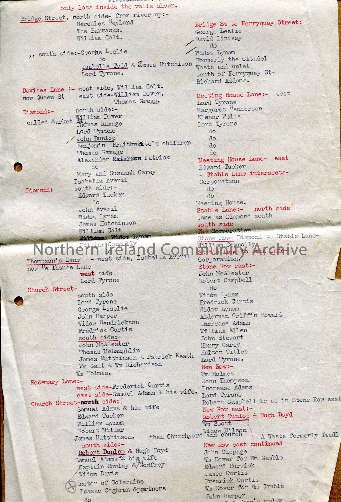 One of 2 pages of typed notes relating to Archibald Stewart’s 1758 map of Coleraine town lots – names of tenants.