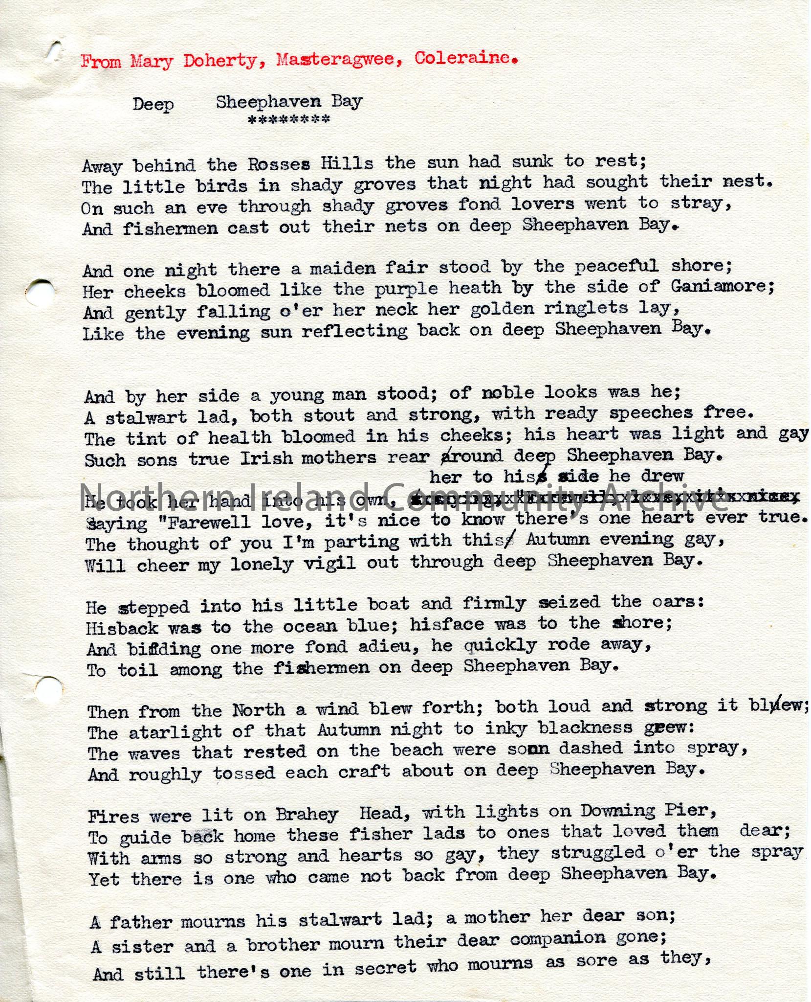 One of 2 pages of typed words to ‘Deep Sheephaven Bay’.