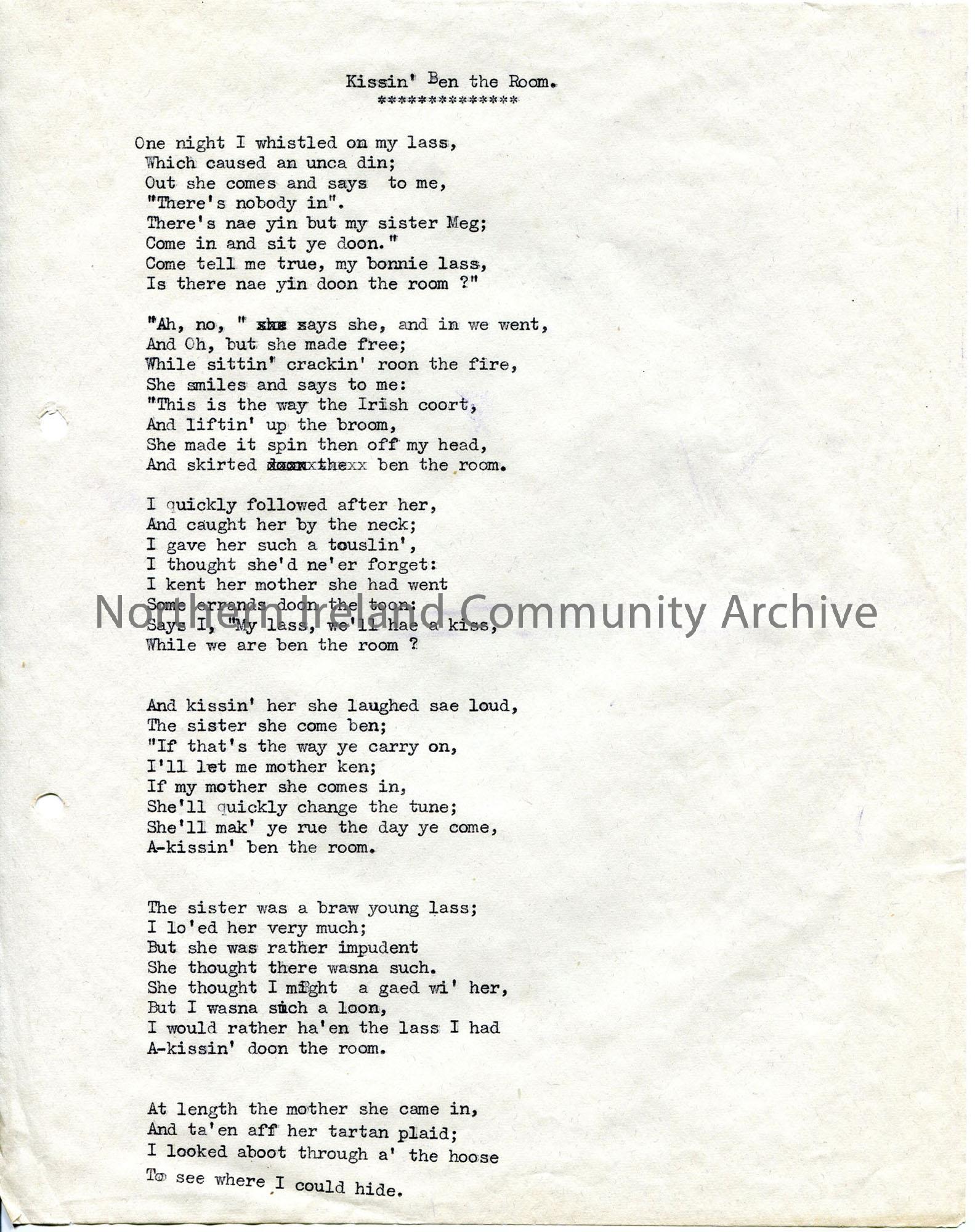 One of 2 pages of typed words to ‘Kissin’ Ben the Room’. Uses local dialect