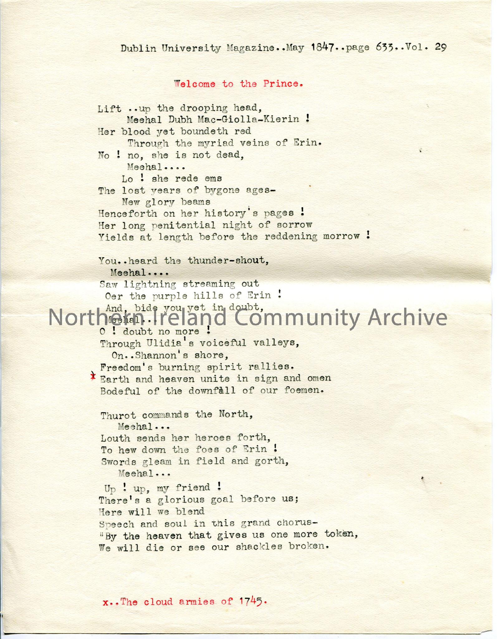 One of 2 pages of typed words to 'Welcome to the Prince' - Bonny Prince Charlie