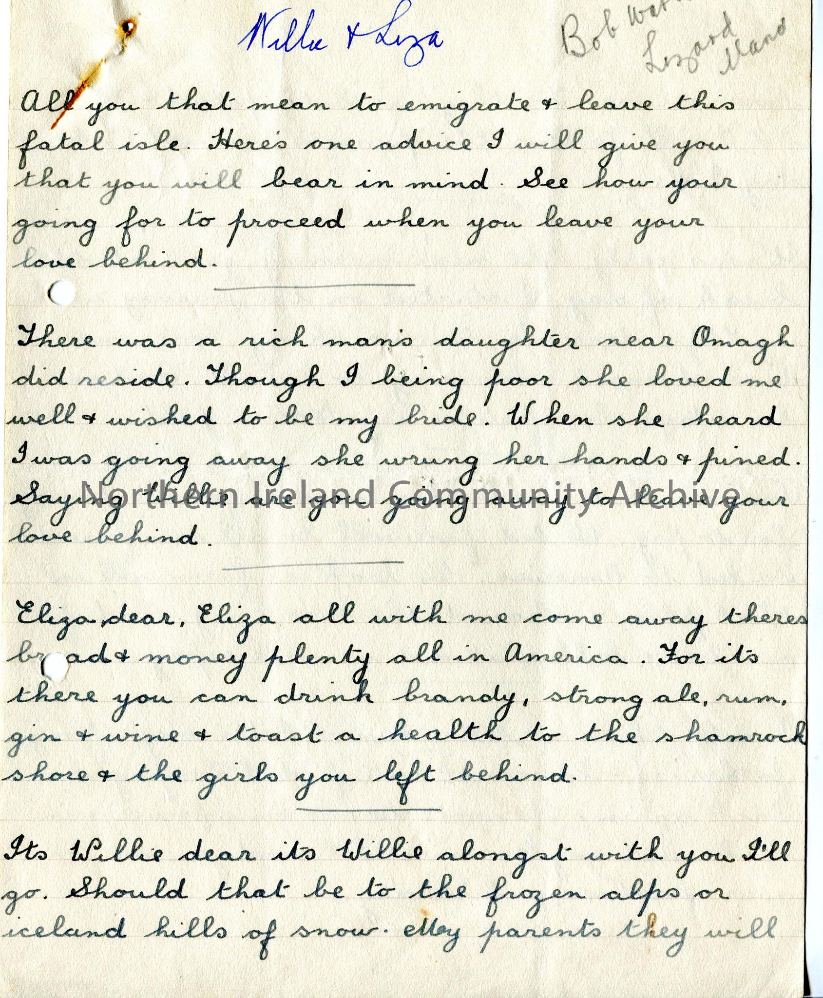 One of 2 pages with handwritten words to ‘Willie and Liza’