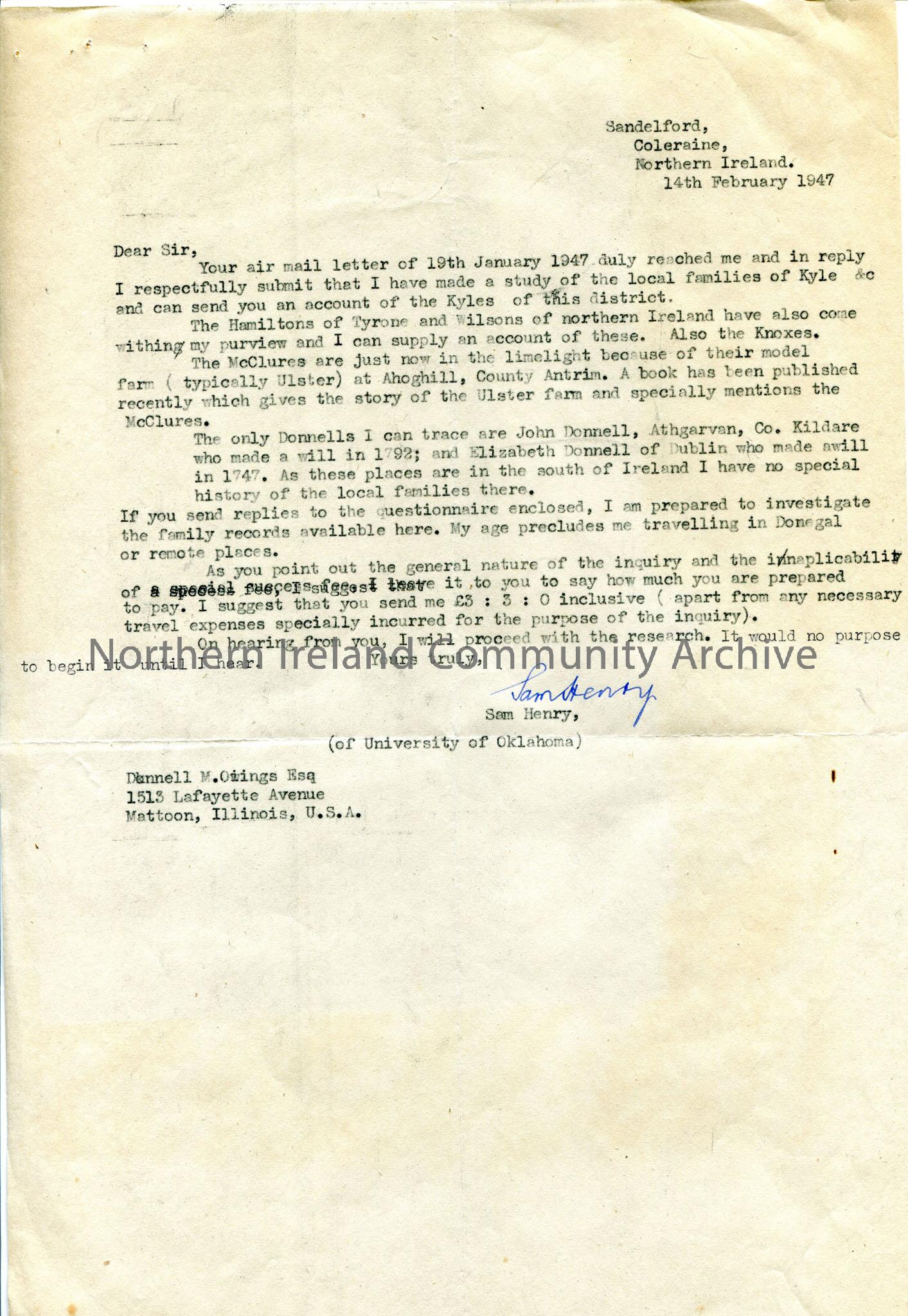 One of 2 typed pages of letter from Sam Henry to Illinois USA resident, with information relating to family line/origins of Kyles and other related families. Mentions 'model farm' of McClures at Ahoghill