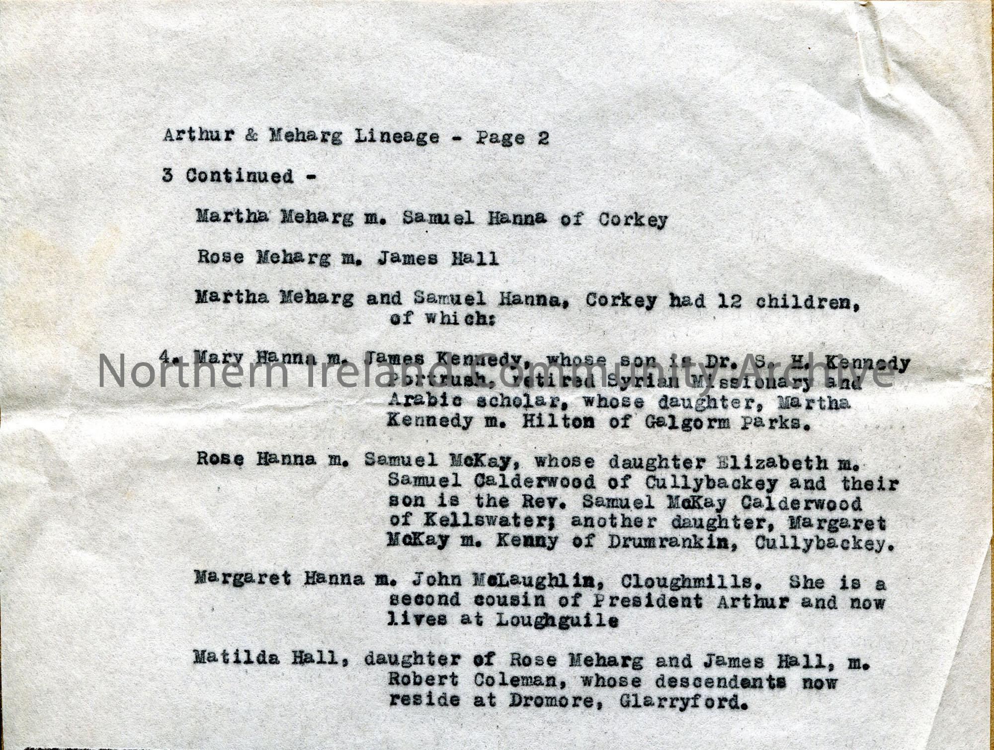 One of 2 typed pages under heading ‘Brief Outline of the Arthur and Meharg Lineage’, giving list of marriages, dates and where resident