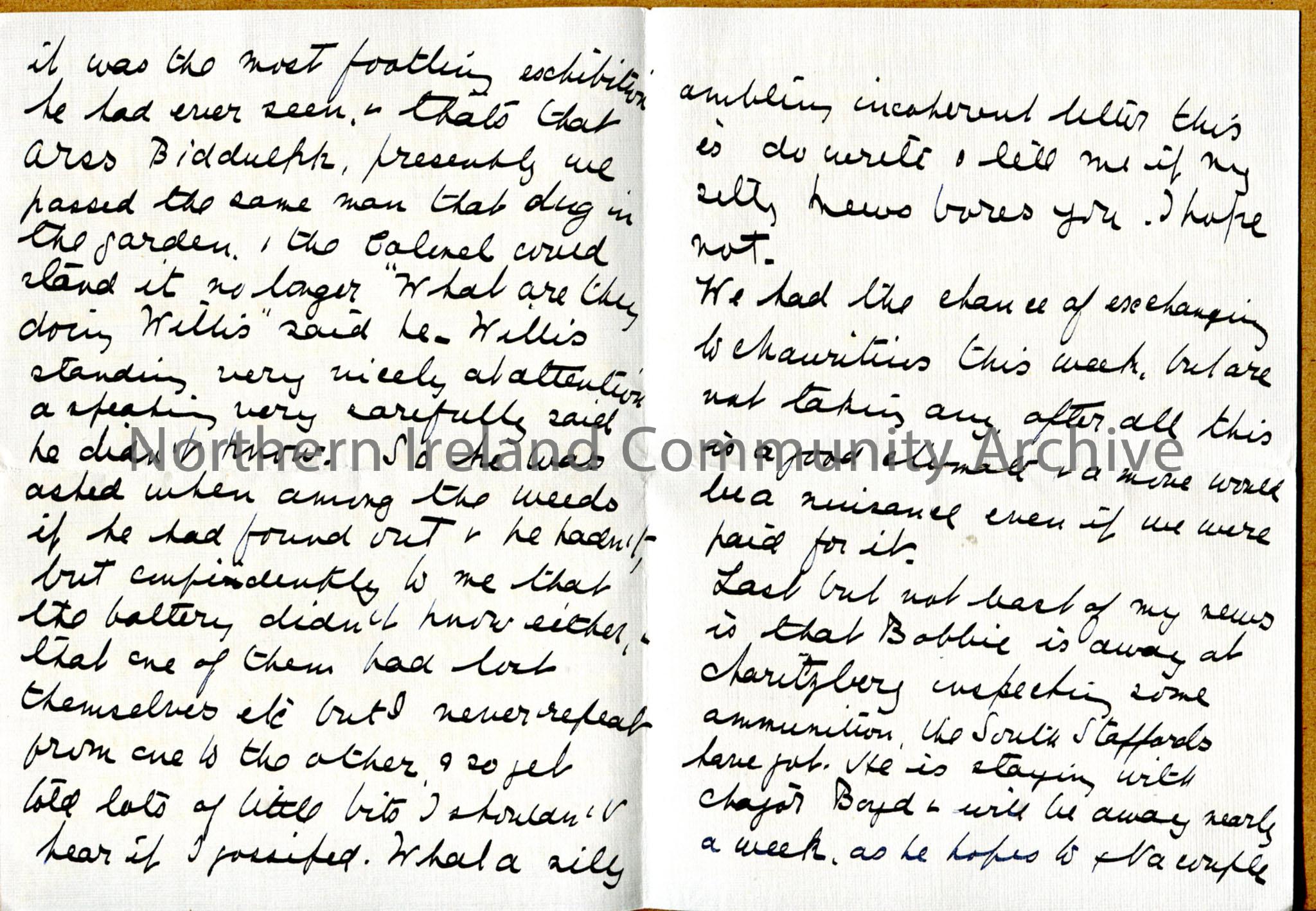 One of 3 double pages (1 white/lined, 2 blue/unlined) of handwritten letter from Dorothy to her mother. Her mother has sent a feather but she is unsur… – img086b
