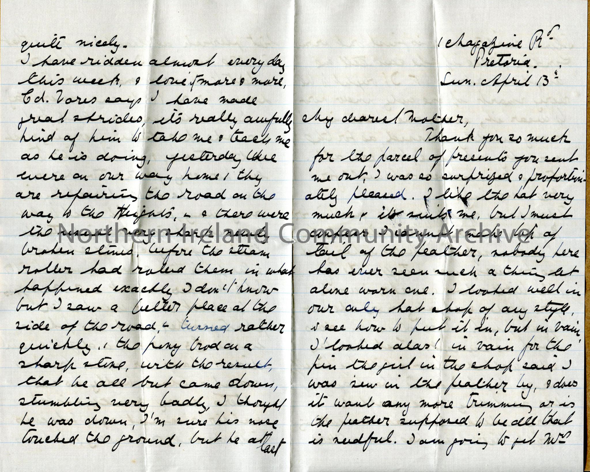 One of 3 double pages (1 white/lined, 2 blue/unlined) of handwritten letter from Dorothy to her mother. Her mother has sent a feather but she is unsure what to do with it. Baby is walking and cutting teeth - thanks her mother for the material etc sent. Out riding daily with Colonel Vores - neighbours disapprove and are cool to her.