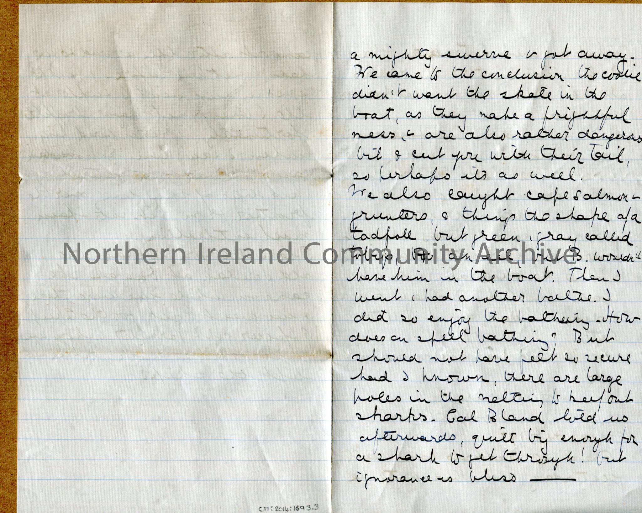One of 3 folded pages of handwritten letter from Dorothy to her mother. Mentions tragic fate of Scott’s expedition to South Pole. Home from stay in Du… – img099b