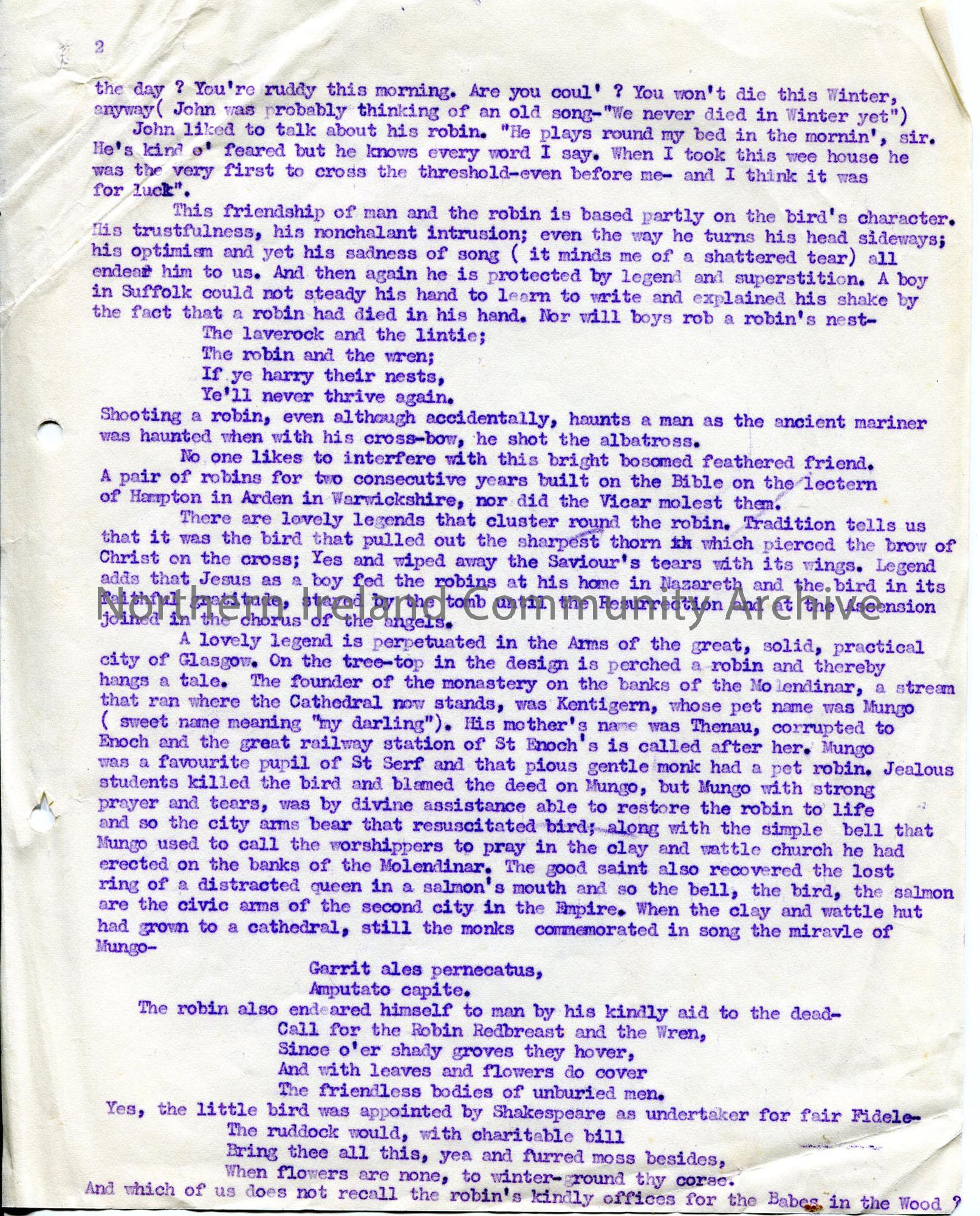 One of 3 numbered pages of typed script – page 1 missing. Songs, folklore and traditions surrounding the Robin Redbreast, including Glasgow ‘legend’. …