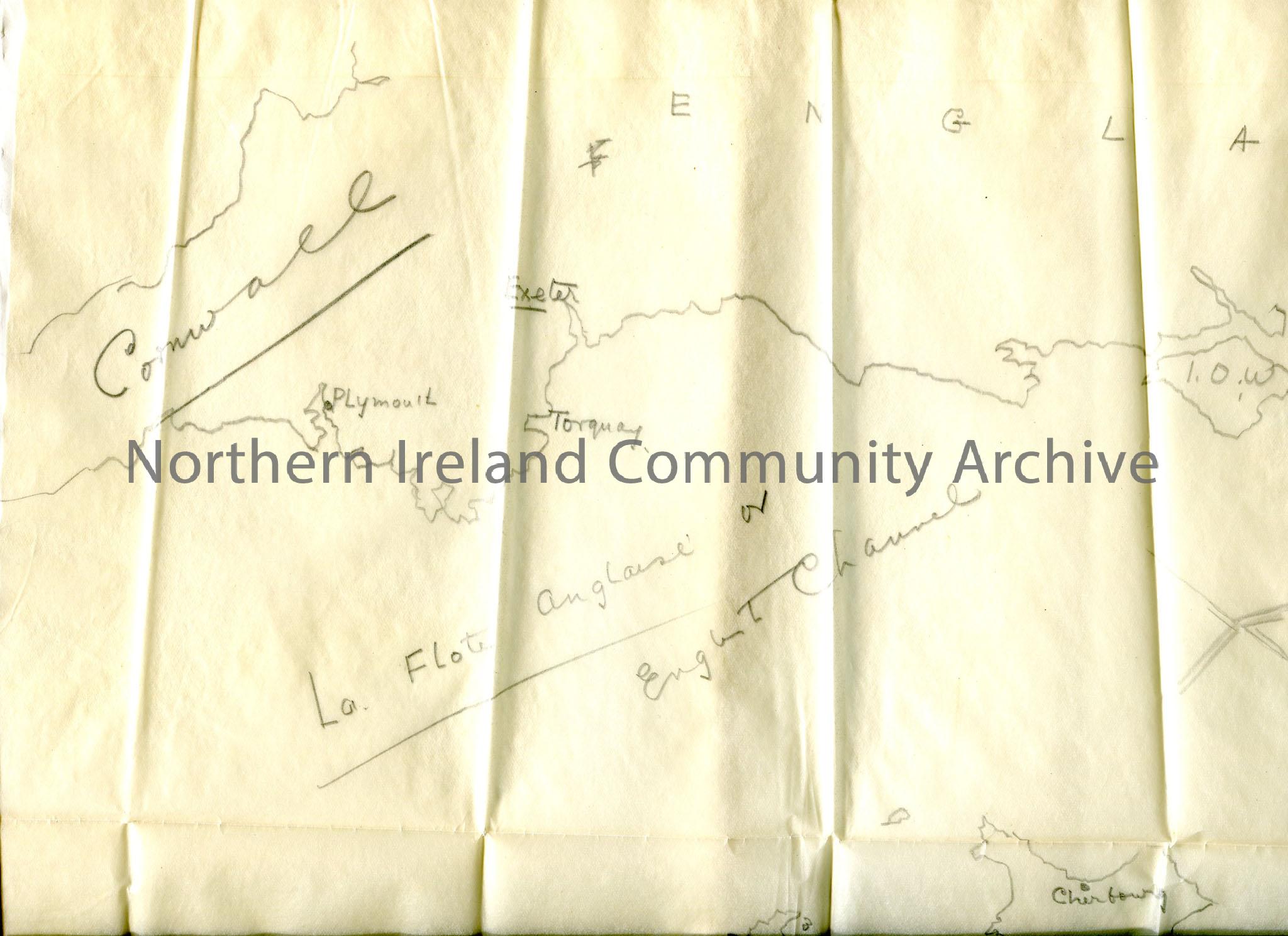 One of 3 pages of communication relating to translations of French statements – the hand drawn map of south England coast and Brittany