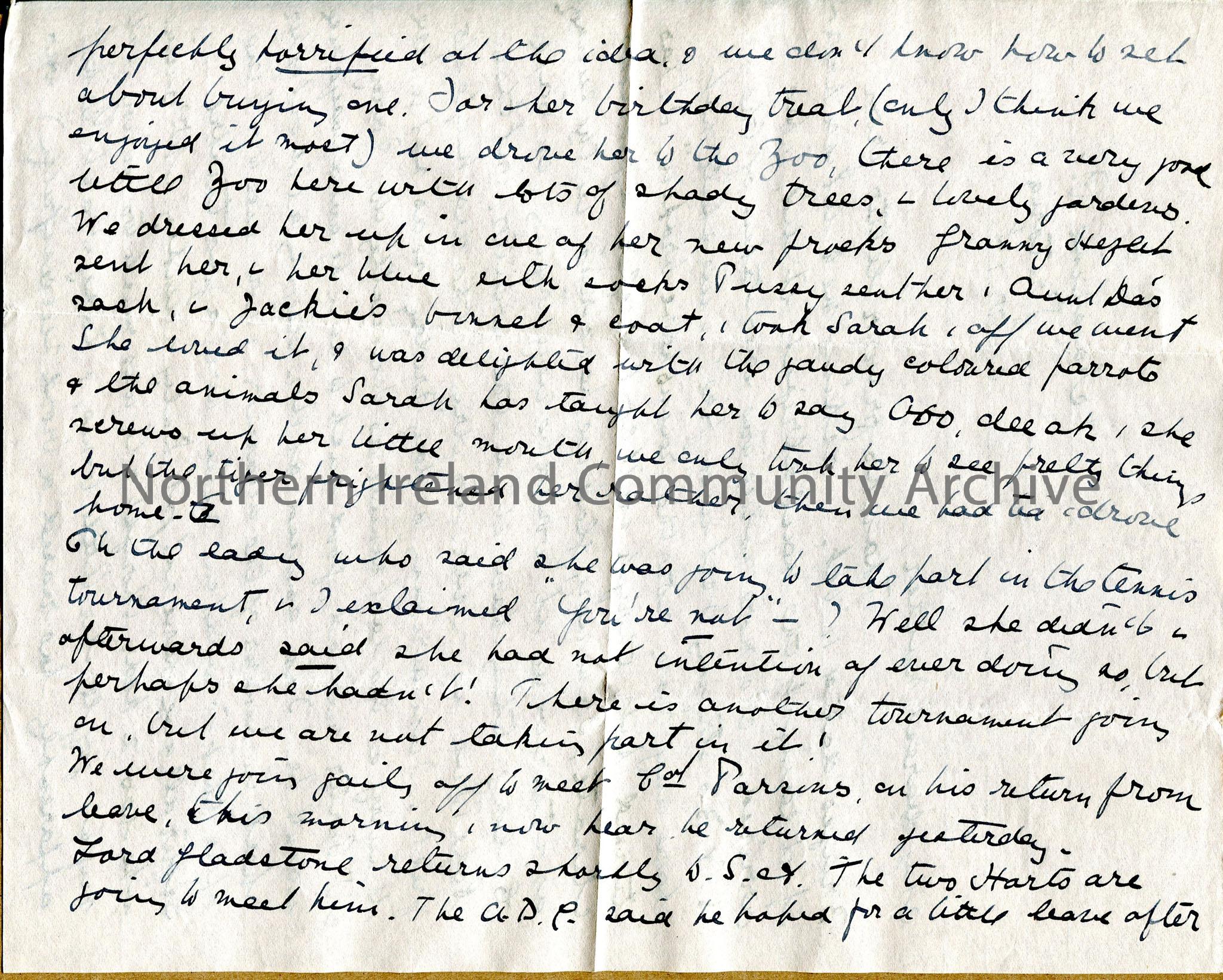 One of 3 pages of handwritten letter. Dressed ‘Baby’ up and took her to zoo for her birthday. Describes a dinner party she held, with details of femal… – img030b