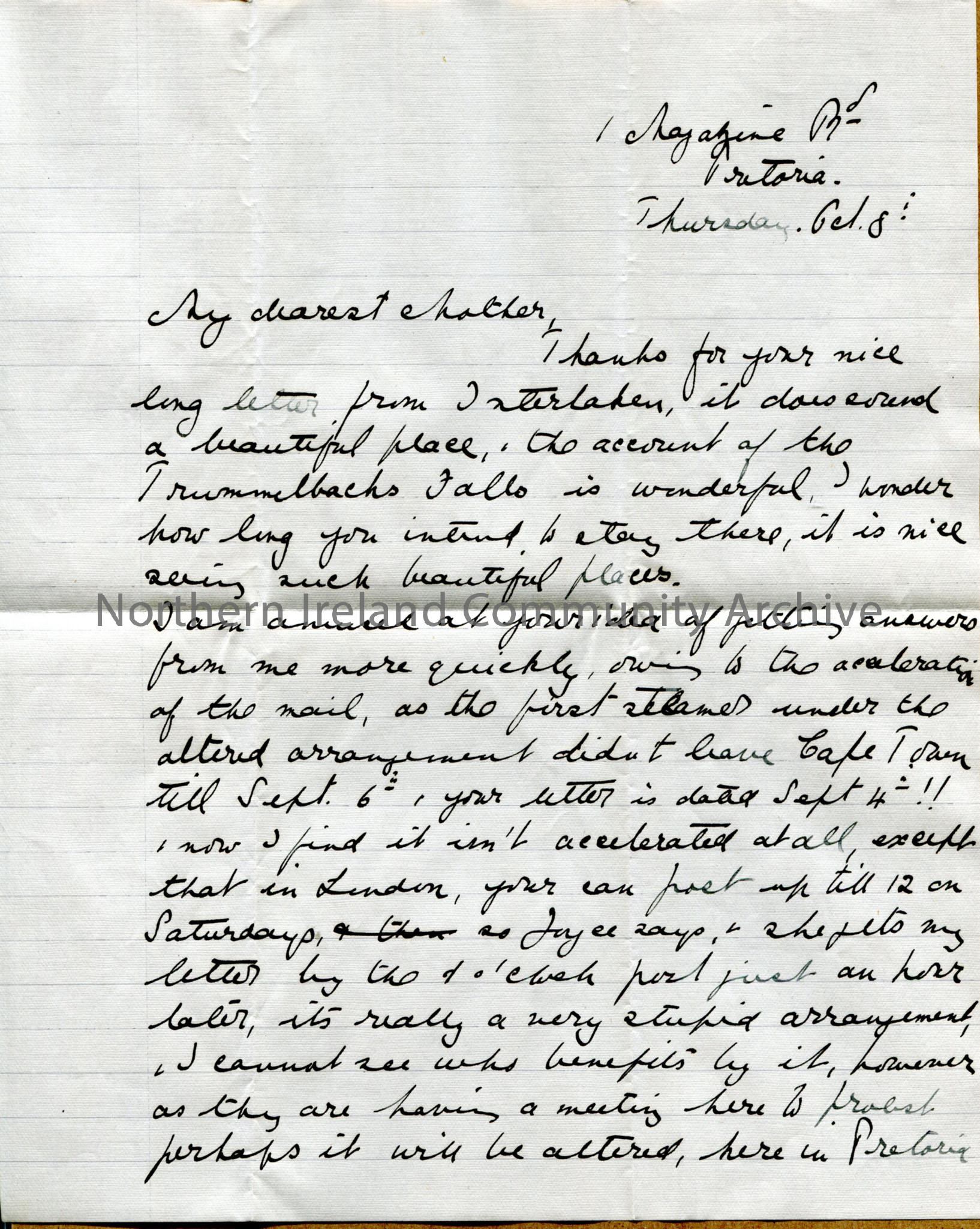 One of 3 pages of handwritten letter from Dorothy to her mother. Dated Thursday 8th October which was 1914 but there is no mention of war - mother is in Interlaken on holiday. Discusses postal arrangements, Bobbie away closing down a depot, baby, garden and weather,