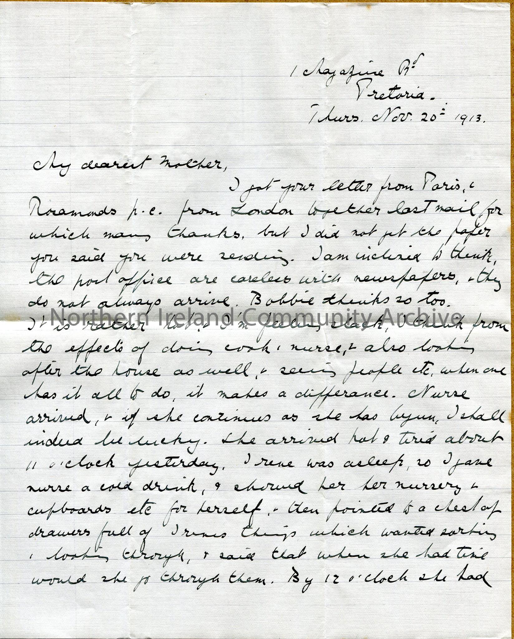 One of 3 pages of handwritten letter from Dorothy to her mother. New nurse has arrived - Irene has taken to her and she is a hard worker - lists all she did in first 2 days, including washing baby's best clothes which 'do not go to coolie'. Sarah (?former servant) is getting married - gave her some of her old wedding presents