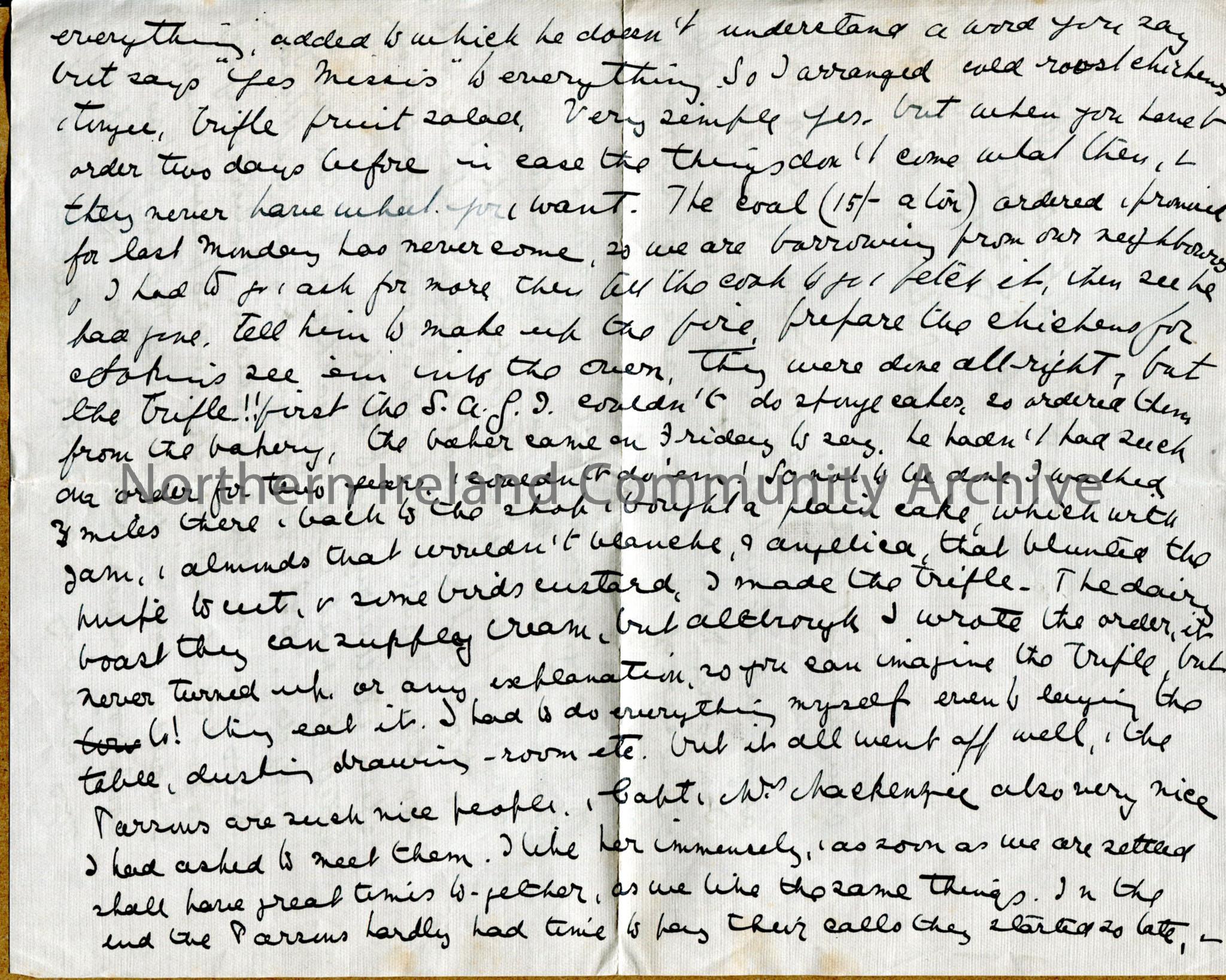 One of 3 pages of handwritten letter from Dorothy to her mother, written on both sides of first 2 pages. Measles outbreak brought in by Somalis; Irene has cut first tooth; servant trouble and Dorothy having to do things she has not done before - Colonel and wife to tea and she had to make trifle; callers and invitations to dine