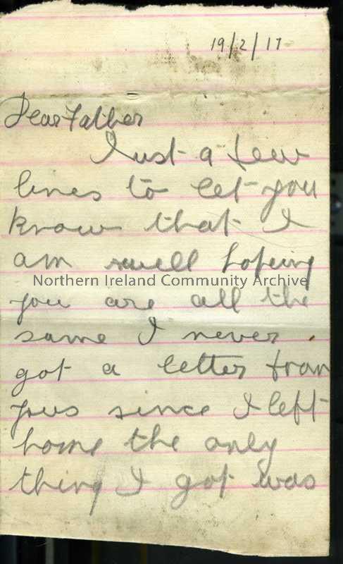 One of 3 pages of handwritten letter from James to his father. Still in Grantham but has not had any letters from home since arrived there. Gives another Grantham address - Belton Park camp