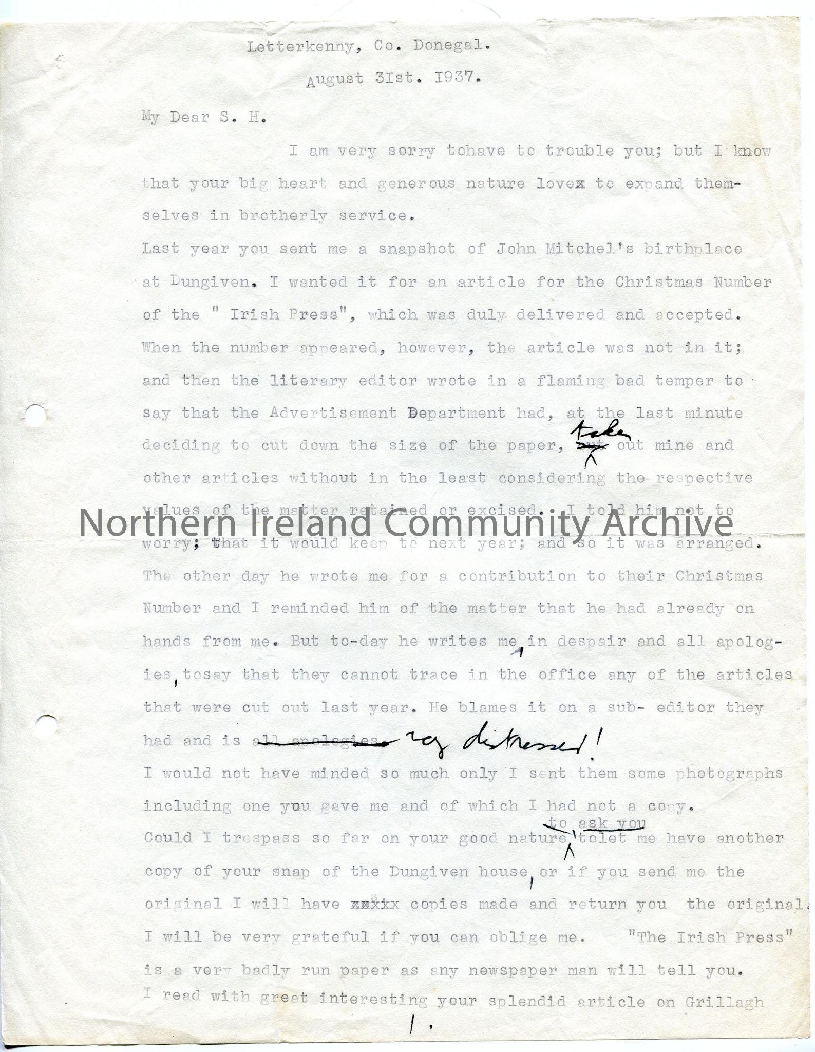 One of 3 pages of handwritten letter from Louis Walsh, asking for photographs of John Mitchel's house at Dungiven, commenting on articles written by Sam which included a poem 'A Shamrock from Tiree, and broadcasts about Ulster and its traditions - Walsh believes Sam can mirror the culture and traditions of the Province