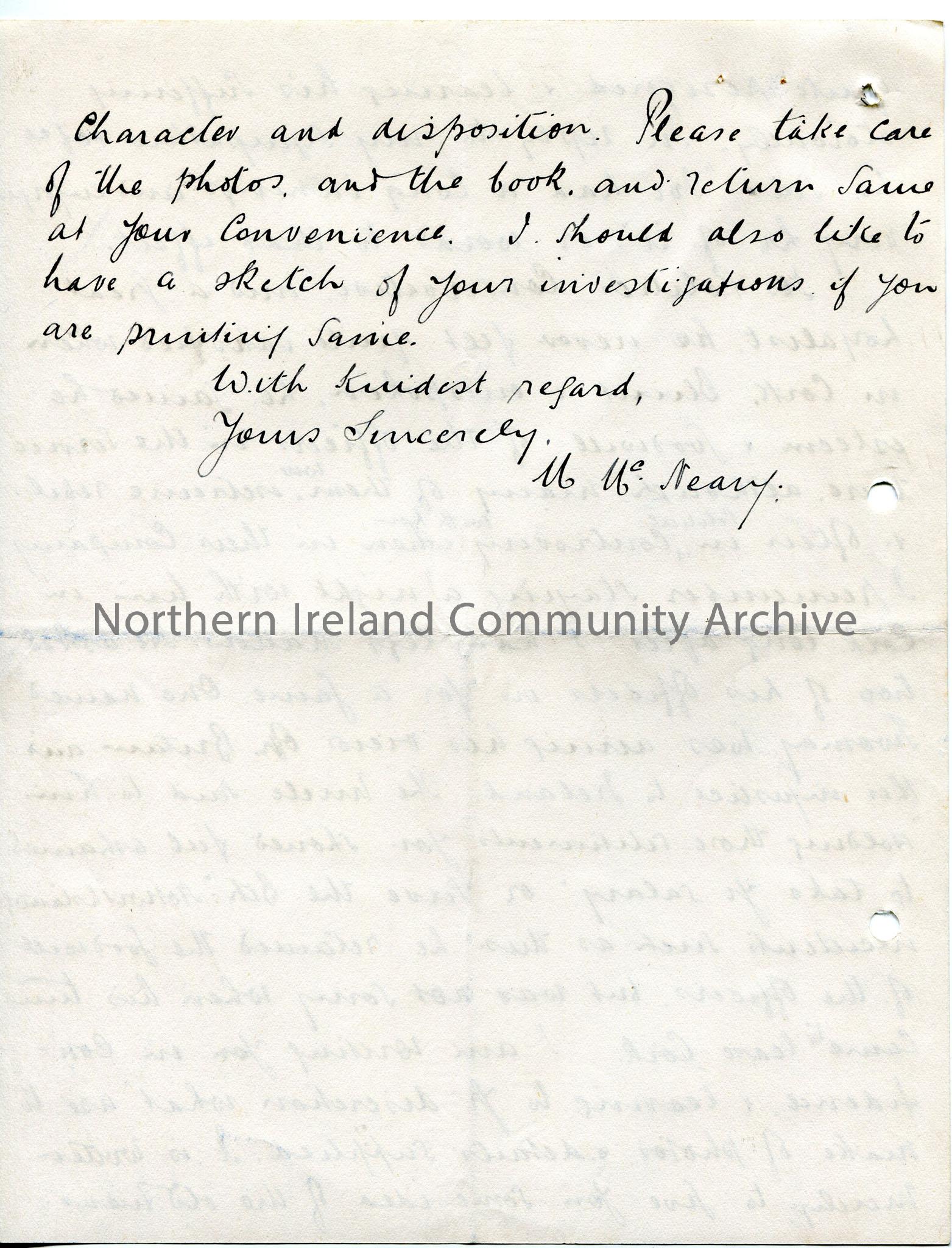 One of 3 pages of handwritten letter from Mark McNeary – thanks Sam for photo of engagement ring and sends him photos and information of Mark and his … – img304