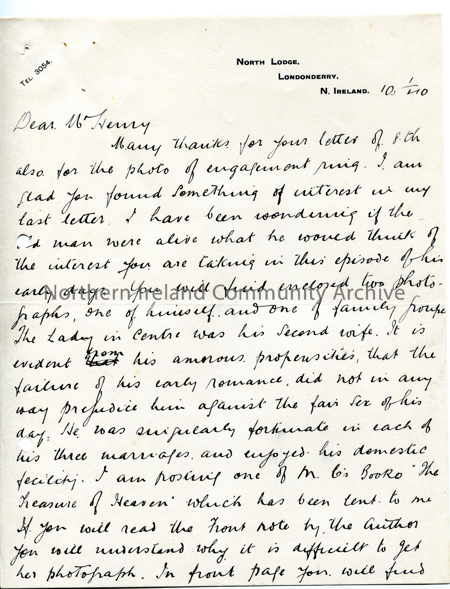 One of 3 pages of handwritten letter from Mark McNeary – thanks Sam for photo of engagement ring and sends him photos and information of Mark and his …