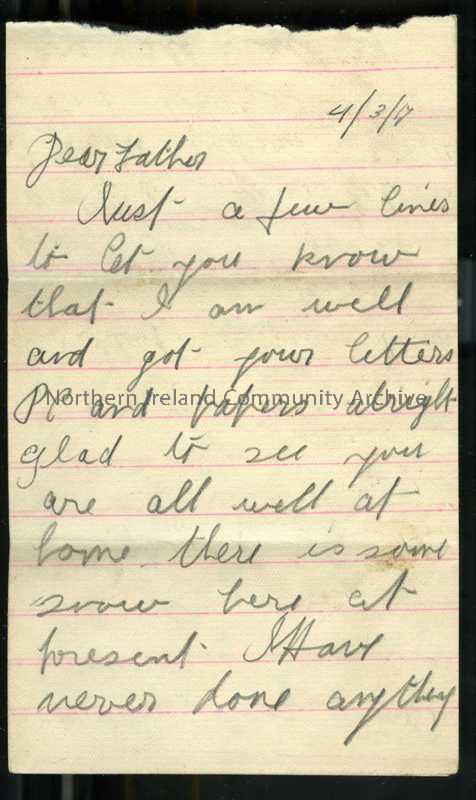 One of 3 pages of handwritten letter in pencil from James to his father. Has now received mail from home. Has not seen Captain McConaghie yet. Mention…