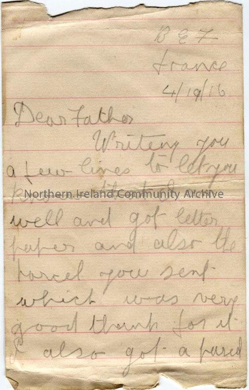 One of 3 pages of handwritten letter in pencil from James to his father. Received letter, paper and parcel with cake and Woodbines