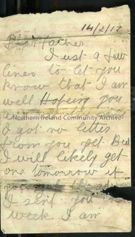 One of 3 pages of handwritten letter in pencil. In new camp in Grantham area – Belton Park. Gives address. Has had no mail from home since arrived in …