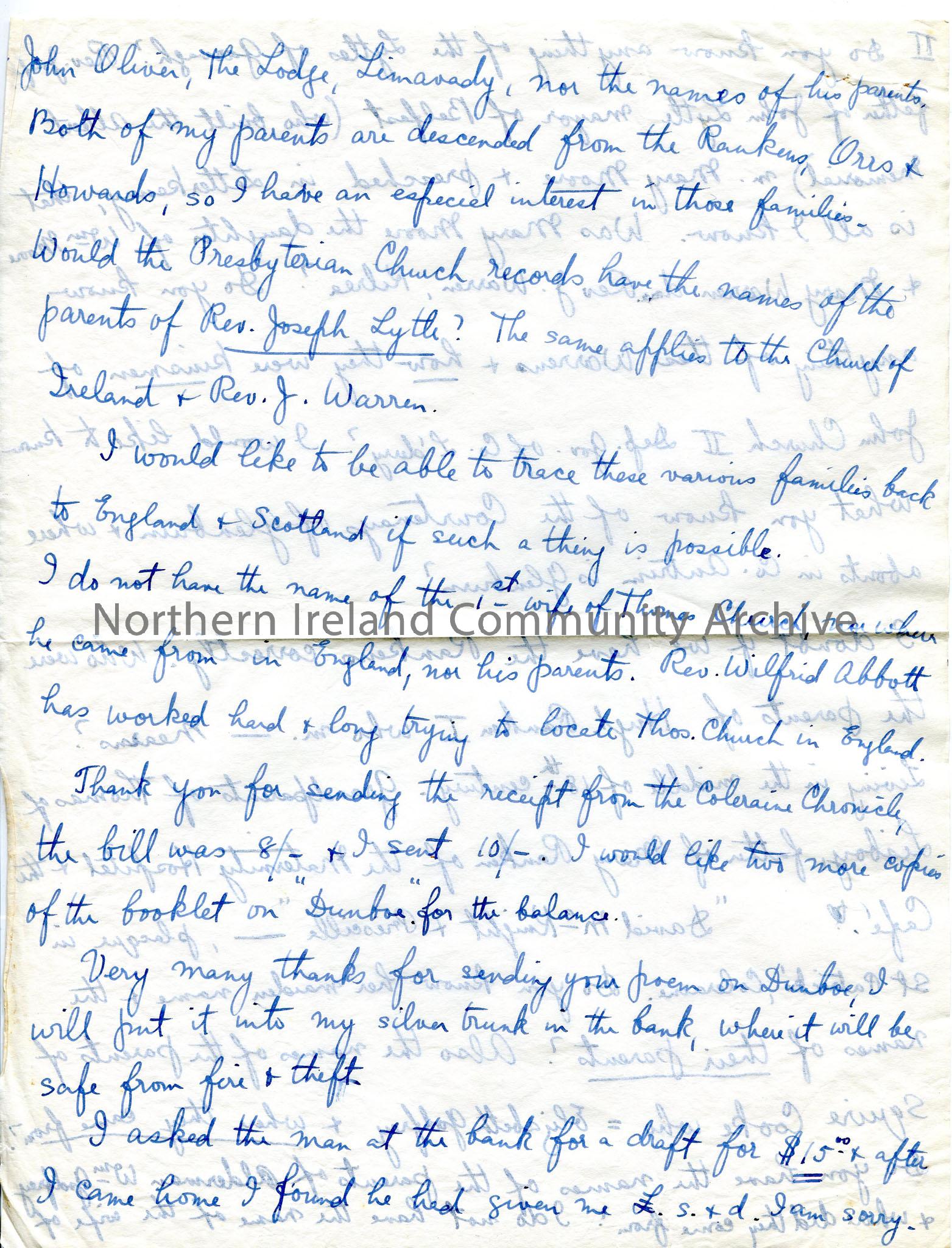 One of 3 pages of handwritten letter, on both sides of fine paper. Looking for much information on several families - Griifin Curtis, Griffin Howard, Orr, Molyneux, Leslies of Leslie Hill, Houstons of Craigs, Smiths of Camus, Godfreys and Churches [members of both served on Coleraine Corporation], Pattons of Myroe - thinks latter may have come from Scotland or England. Does Sam know of the names Kenning, McLelland [McClellan/McClelland], Mearns, Meharg [Maharg]