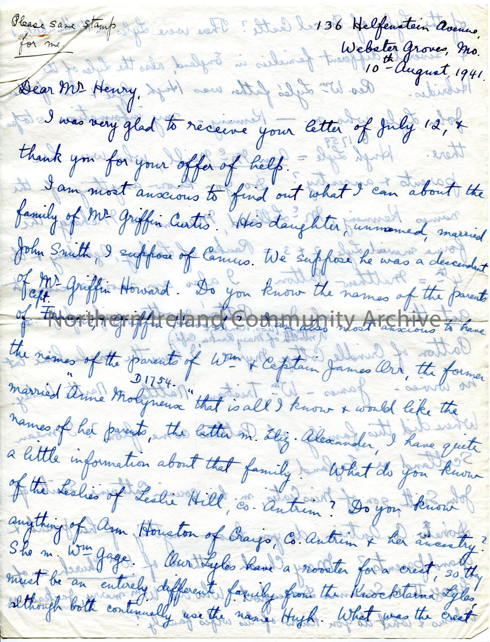 One of 3 pages of handwritten letter, on both sides of fine paper. Looking for much information on several families - Griifin Curtis, Griffin Howard, Orr, Molyneux, Leslies of Leslie Hill, Houstons of Craigs, Smiths of Camus, Godfreys and Churches [members of both served on Coleraine Corporation], Pattons of Myroe - thinks latter may have come from Scotland or England. Does Sam know of the names Kenning, McLelland [McClellan/McClelland], Mearns, Meharg [Maharg]