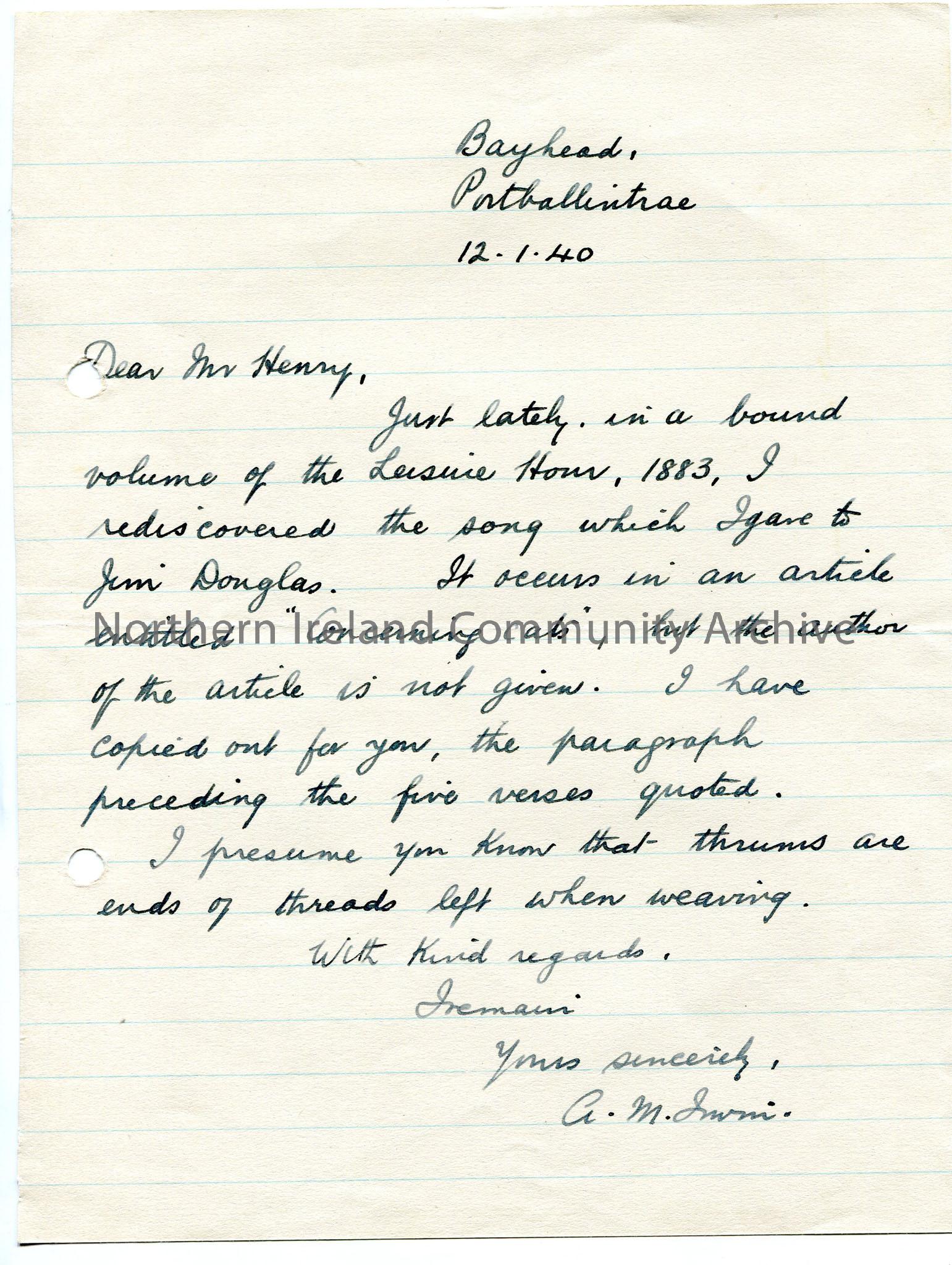 One of 3 pages of handwritten letter re a Scottish song – ‘The Song of the Cat’, including copied extract from a bound journal , which discusses the ‘…