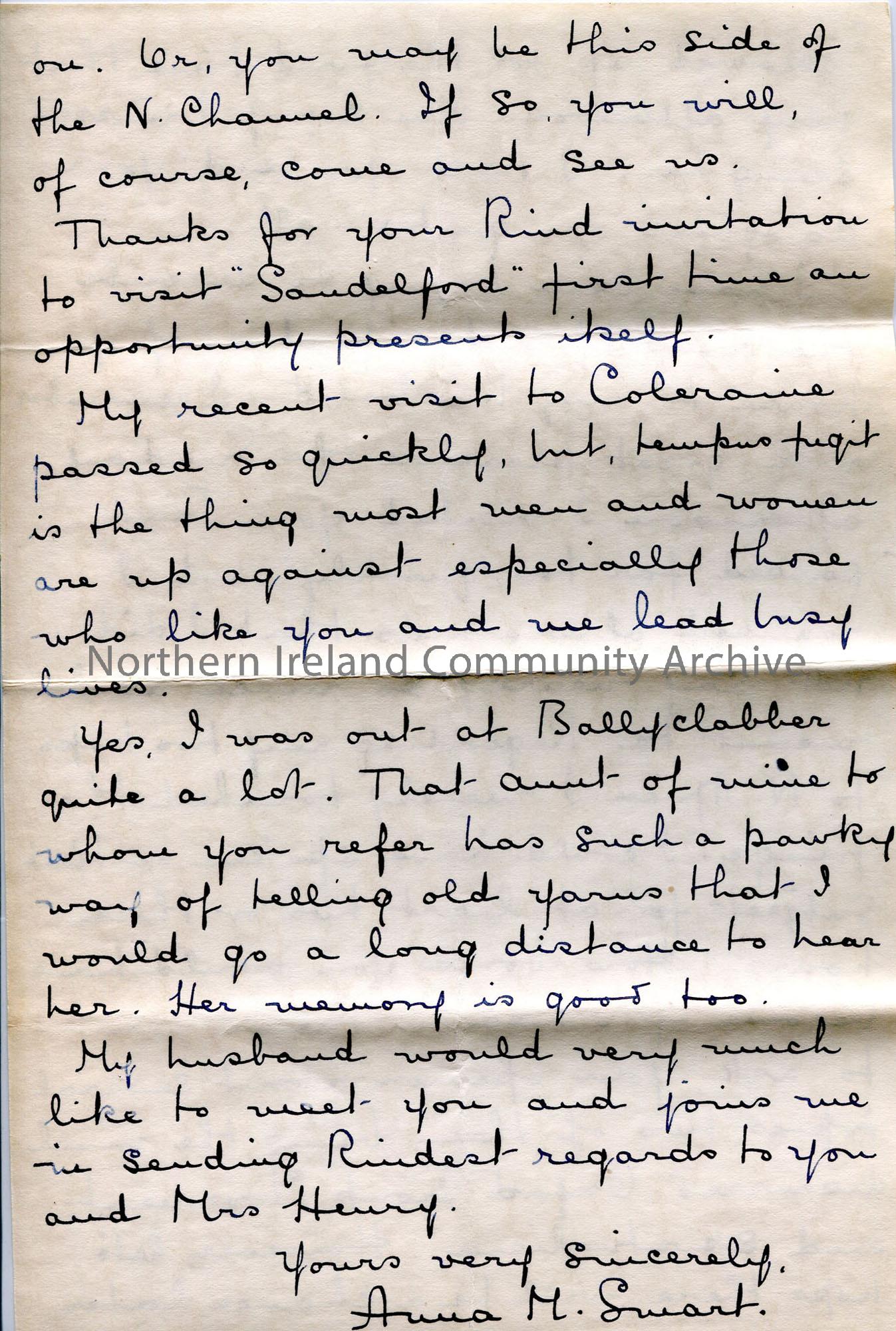 One of 3 pages of handwritten letter, using 5 sides. Anna Smart has passed Sam’s requests on to Mr Fraser. Talks of visit to Coleraine, especially to … – img702b