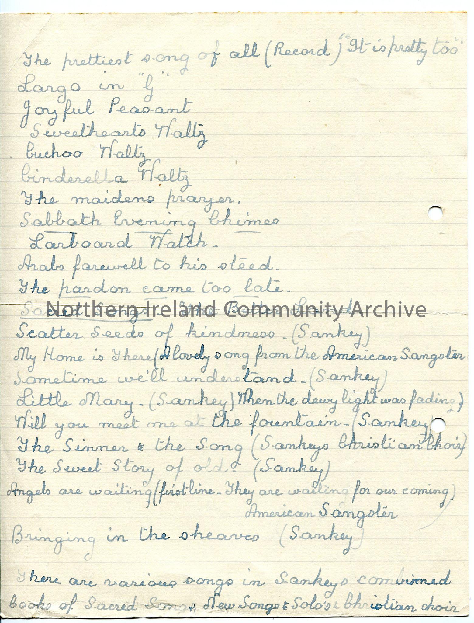 One of 3 pages of handwritten letter, with list of song titles and comments on broadcasts and especially how much they mean to those who are housebound