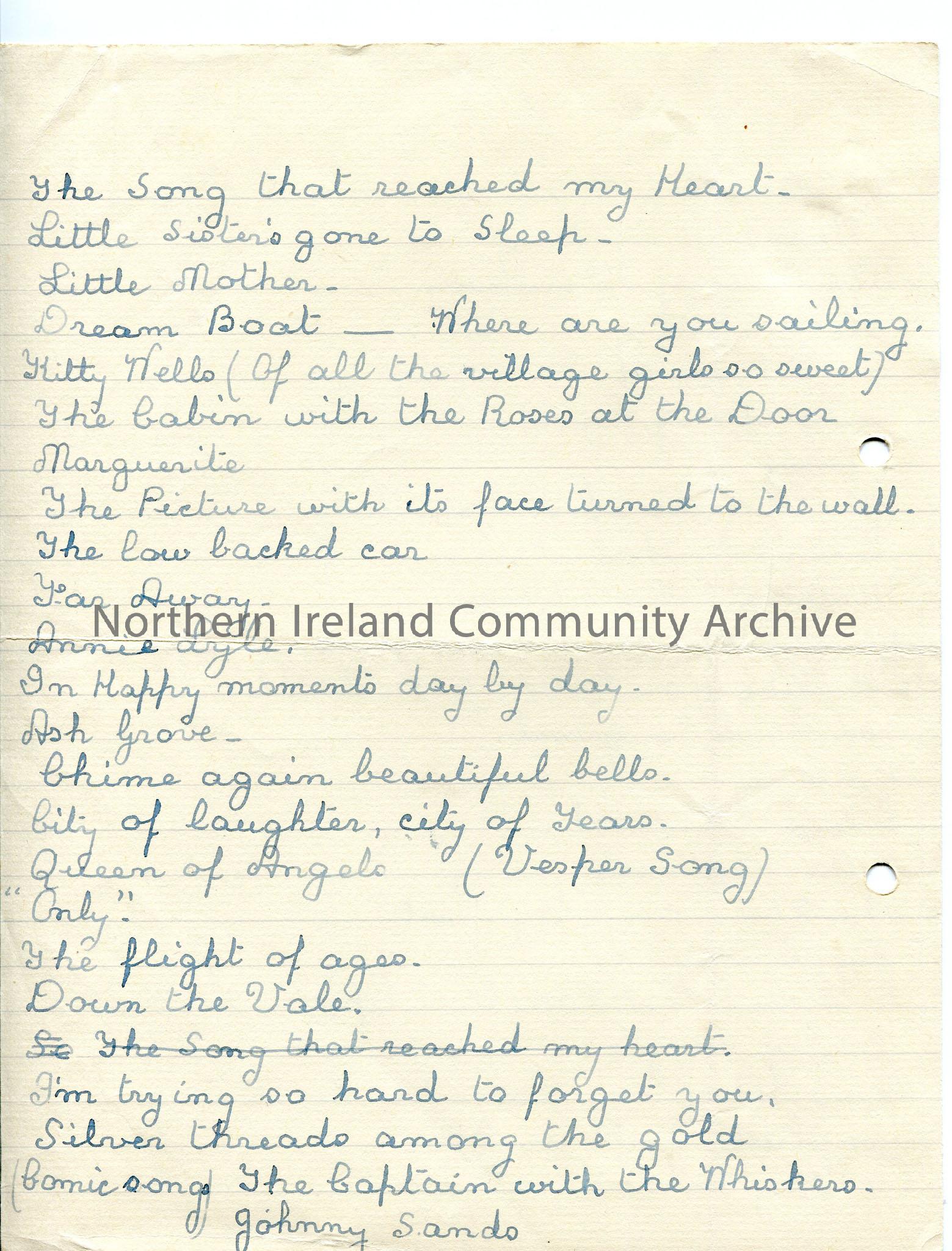 One of 3 pages of handwritten letter, with list of song titles and comments on broadcasts and especially how much they mean to those who are housebound