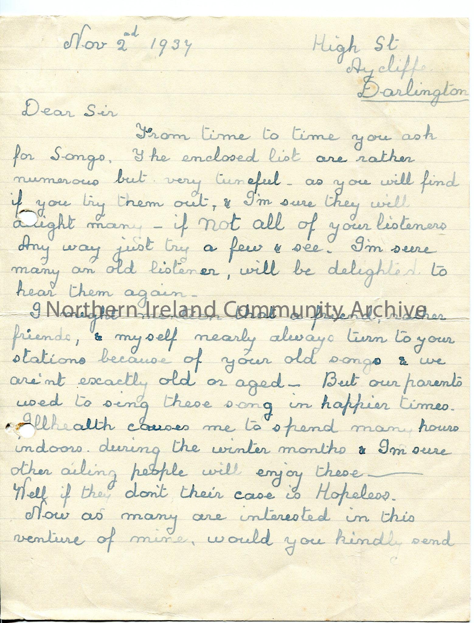 One of 3 pages of handwritten letter, with list of song titles and comments on broadcasts and especially how much they mean to those who are housebound