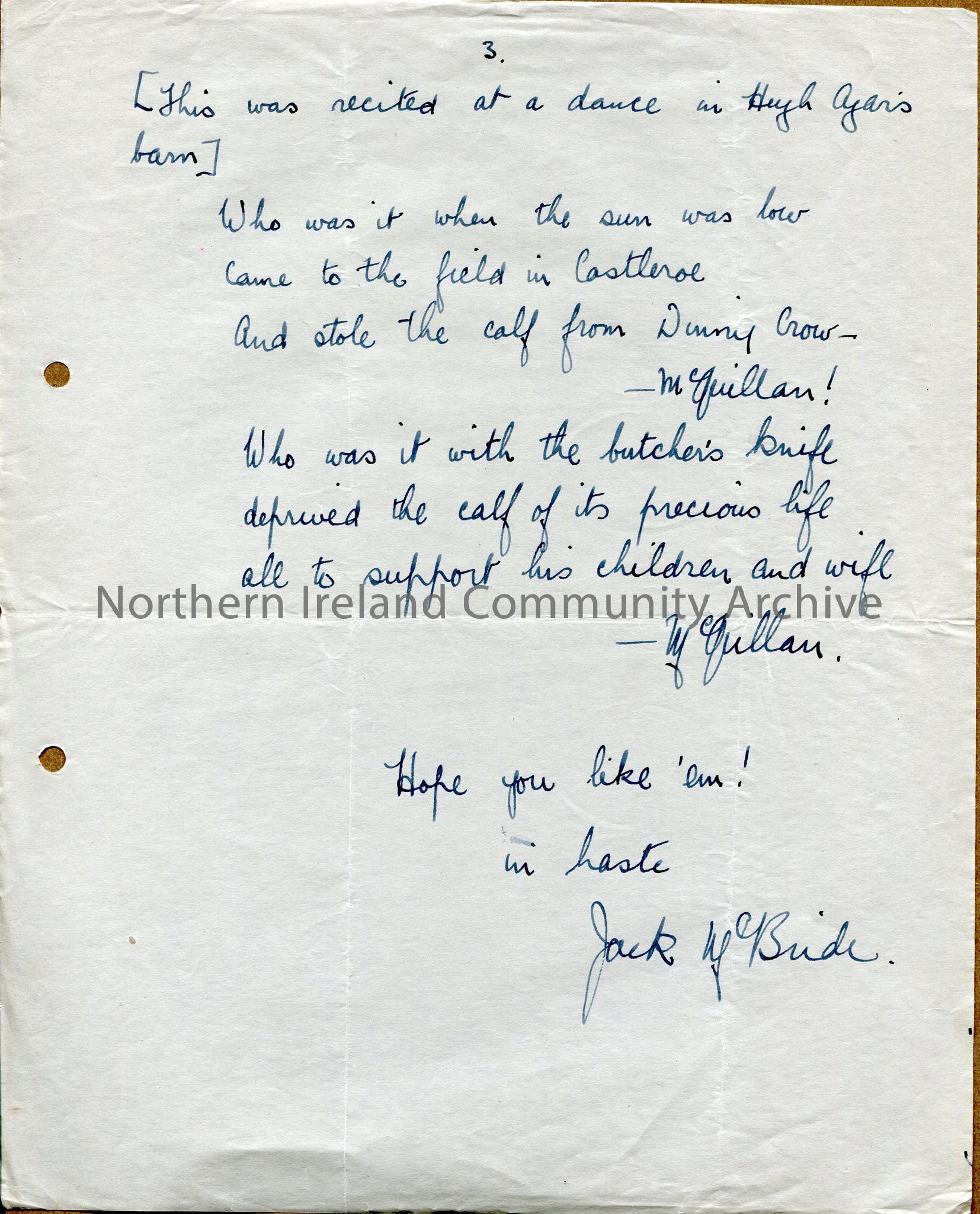 One of 3 pages of handwritten letter with words to songs collected by author, with notes to where and who from he obtained them e.g. dance in barn. Co…